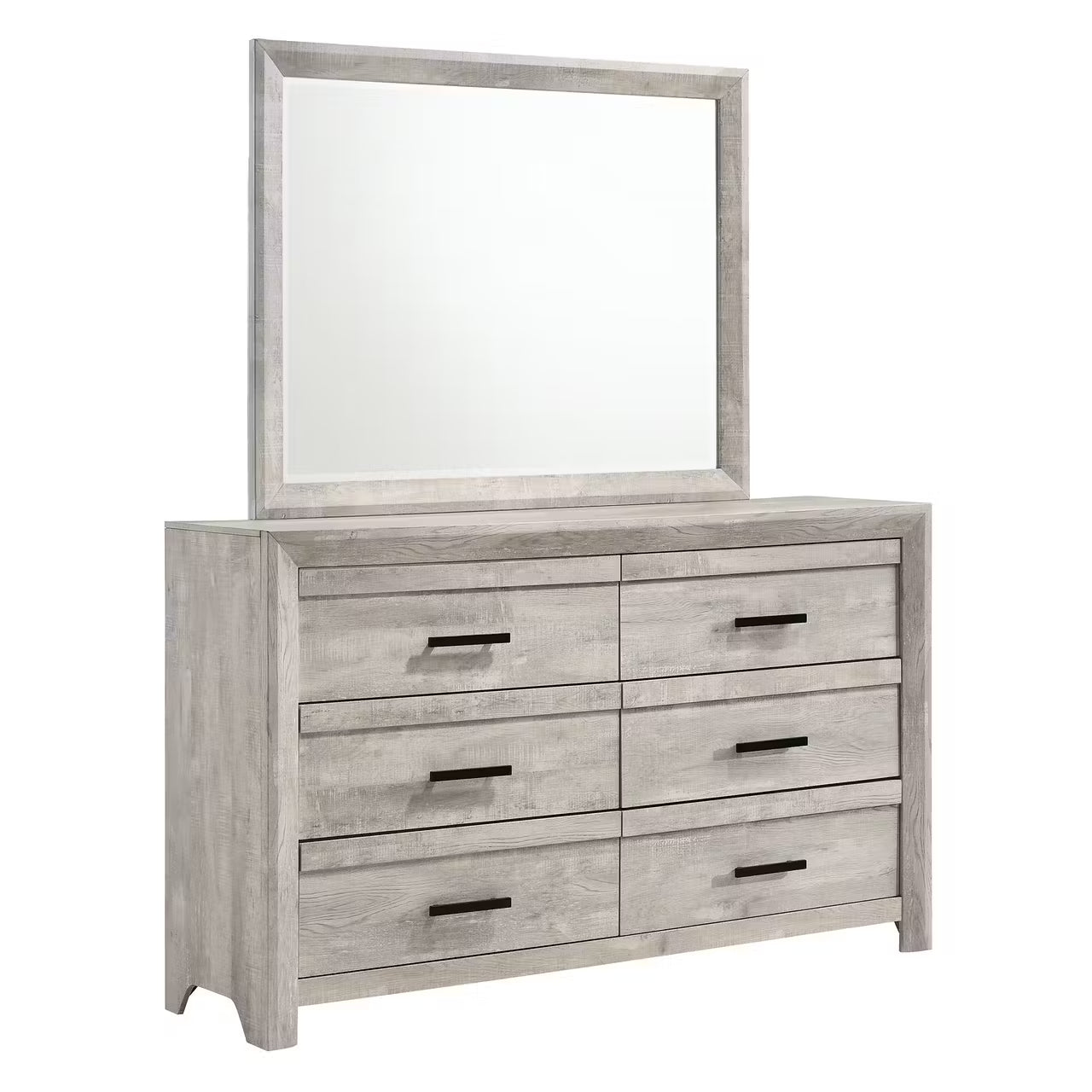 The Abby Group Set includes the Abby bed frame, the chest, dresser and mirror, and the nightstand.