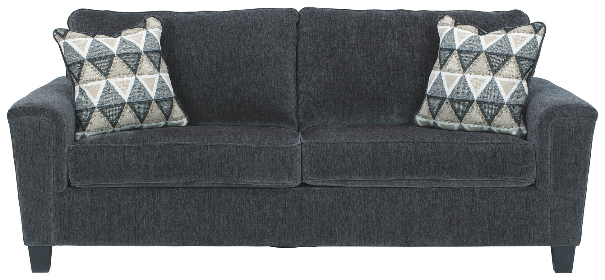 Covered in an upholstery loaded with plush texture, this less-is-more contemporary sofa is dressed to impress with angled side profiling and track armrests wrapped with a layer of pillowy softness for that little something extra. Crisp and clean, the 2-over-2 cushion styling adds up to one sensational look.