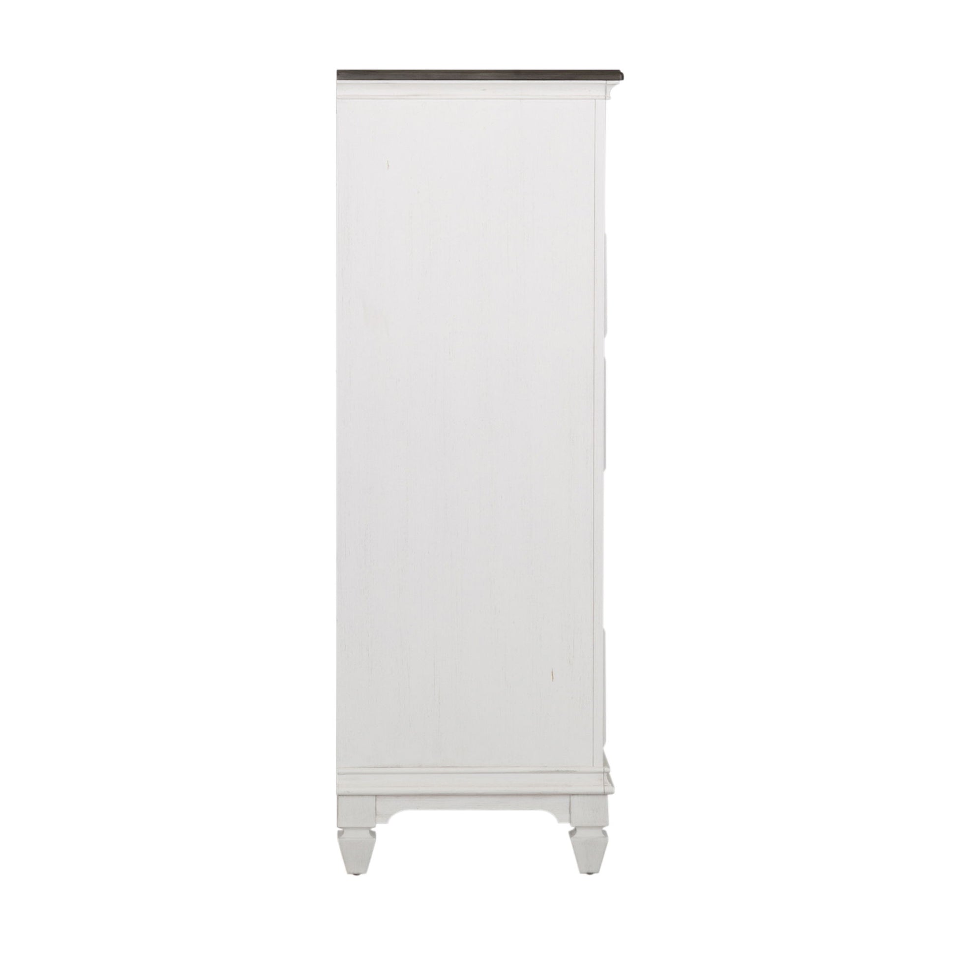 Enhance your room with the Allyson Park chest. Crafted with pine solids and veneers. This piece features felt lined top drawers, fully stained interior drawers, beautiful bead molding, and is anchored by tapered feet.