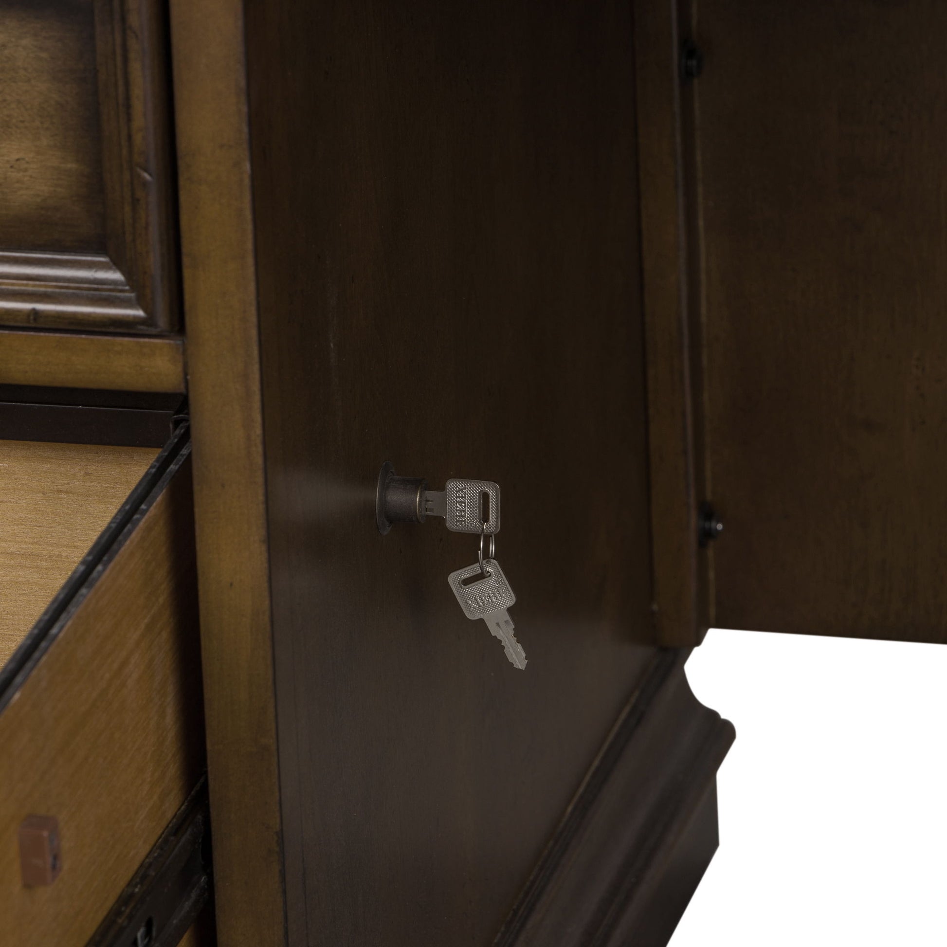 Indulge in traditional styling with the Amelia credenza. Crafted by poplar solids and birch veneers, this piece features an antiqued toffee finish, chamfered corners with a soft concave shaping, framed drawer and door fronts with overlays, and a flip down keyboard tray. With today's modern technology in mind, users can enjoy the convenience of the built-in wire management. Storage abounds with the fully stained full extension drawers, pull-out printer/CPU drawer, and lockable file drawer accented by brass bail pull and knob hardware.