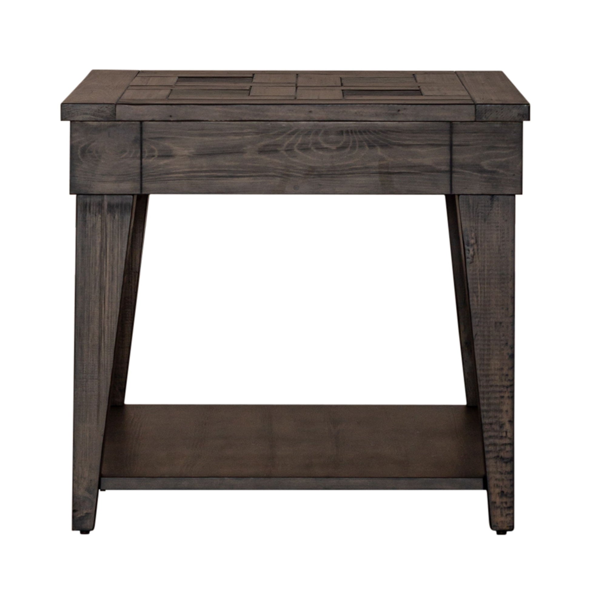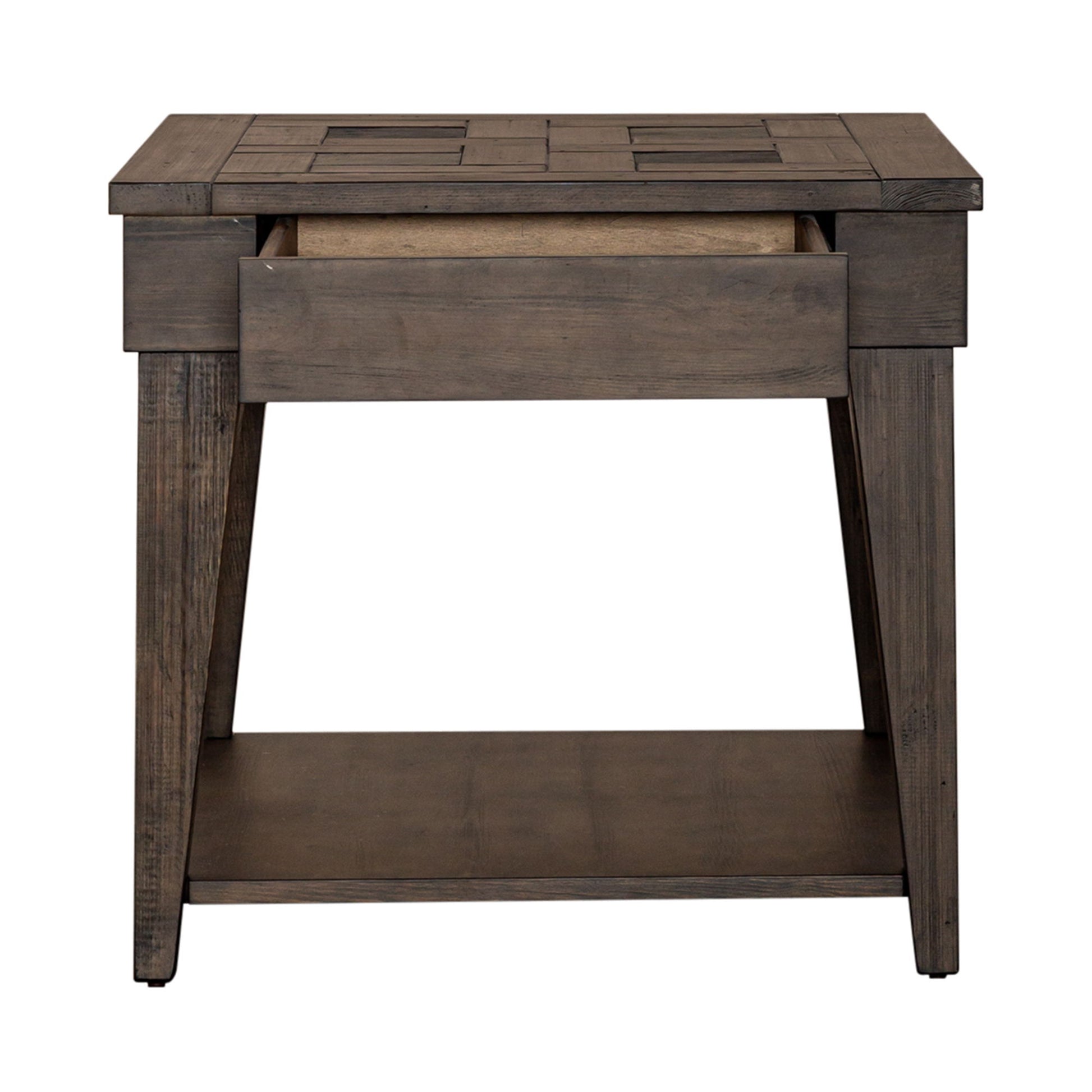 If you enjoy rustic the Arrowcreek end table is for you. Finished in a weathered stone with slate tile inserts in a basket weave design on top, one full extension drawer with finger pull, tapered legs and bottom shelf for additional storage. Crafted with solid reclaimed pine and pine veneer with a bottom shelf for additional storage.