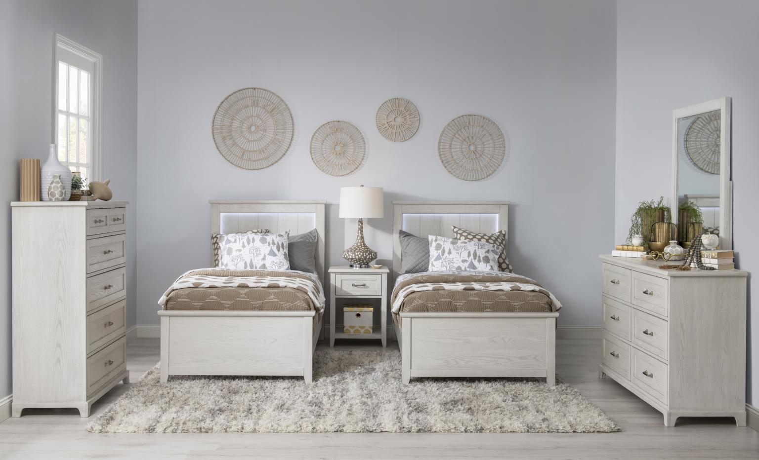 The Ashton youth collection is a unique blend of style elements that give a modern bohemian vibe. Details such as thick framed drawer fronts, shaped feet and plank details on beds all blend well. Features can be found throughout the group, such as touch lighting on beds and a cool bookcase headboard with shelf storage on the sides of the headboard. The Bleached Linen finish on White Oak veneers offers a subtly beautiful tone. Brushed Nickel hardware completes each piece.