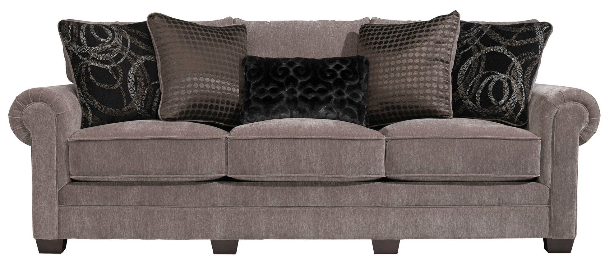 AUSTIN is a rolled arm Transitional design in a soft chenille fabric, featuring five toss pillows - and faux fur!