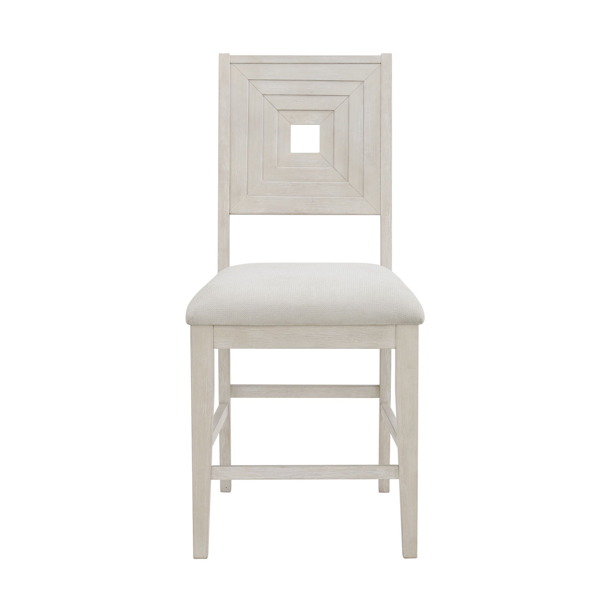 Introducing the Avalanche Counter Side Chair, where modern elegance meets comfort. Adorned with raised geometric patterns and finished in antique white, it exudes contemporary sophistication. The center square cut-out on the chair back adds a unique design element, enhancing its visual appeal. Enjoy plush foam seating upholstered in soft, light fabric, ensuring comfort during meals and gatherings. Designed with a modern sensibility, this side chair complements any counter-height dining space effortlessly. Whether used for casual dining or hosting guests, the Avalanche Counter Side Chair offers a perfect combination of style, comfort, and functionality.