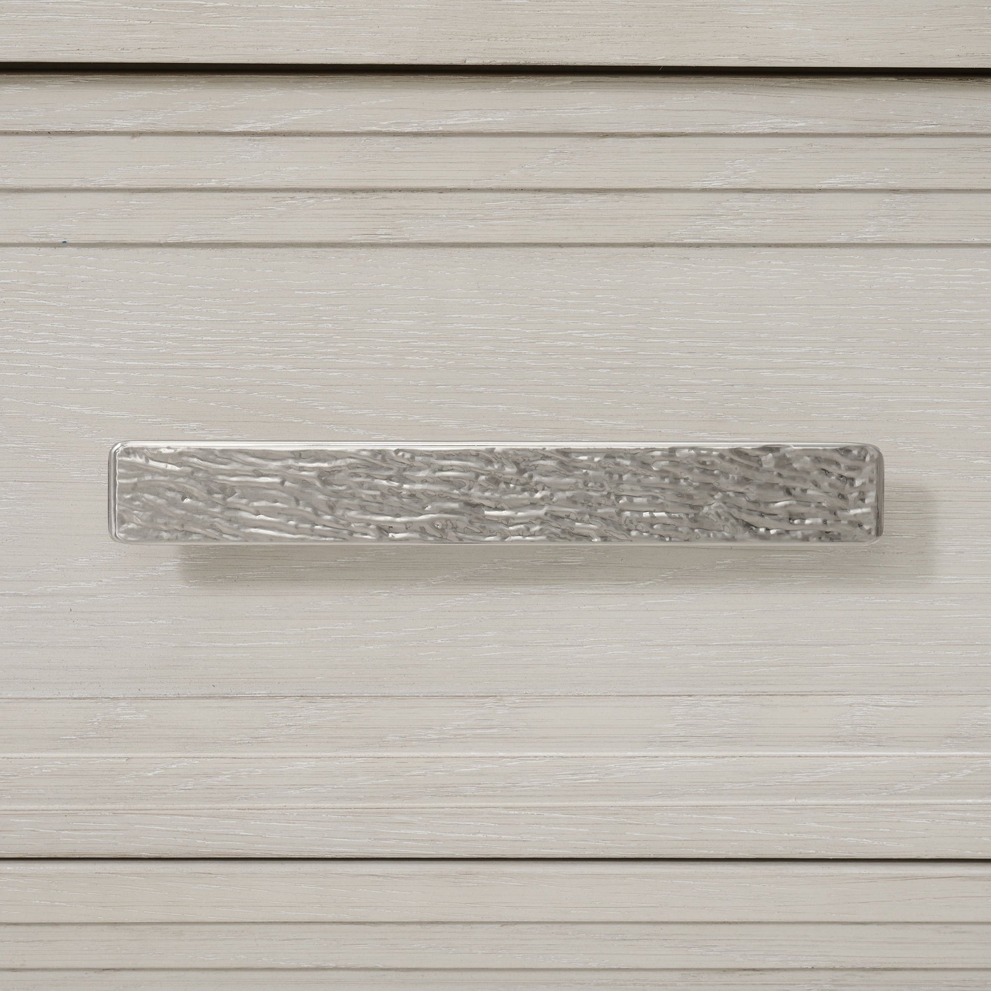 Introducing the Avalanche Server, where modern style meets timeless elegance. This exquisite piece showcases intricate raised geometric patterns integrated throughout its design, finished in a charming antique white that exudes sophistication and grace. The top drawer, lined with grey felt, offers a touch of luxury, while metal hammered hardware adds a rustic, artisanal feel. With three spacious drawers and two large cabinets, this server provides ample storage for all your dining essentials. Perfectly blending functionality and beauty, the Avalanche Server is a stunning centerpiece that enhances any dining room with its refined, contemporary appeal.