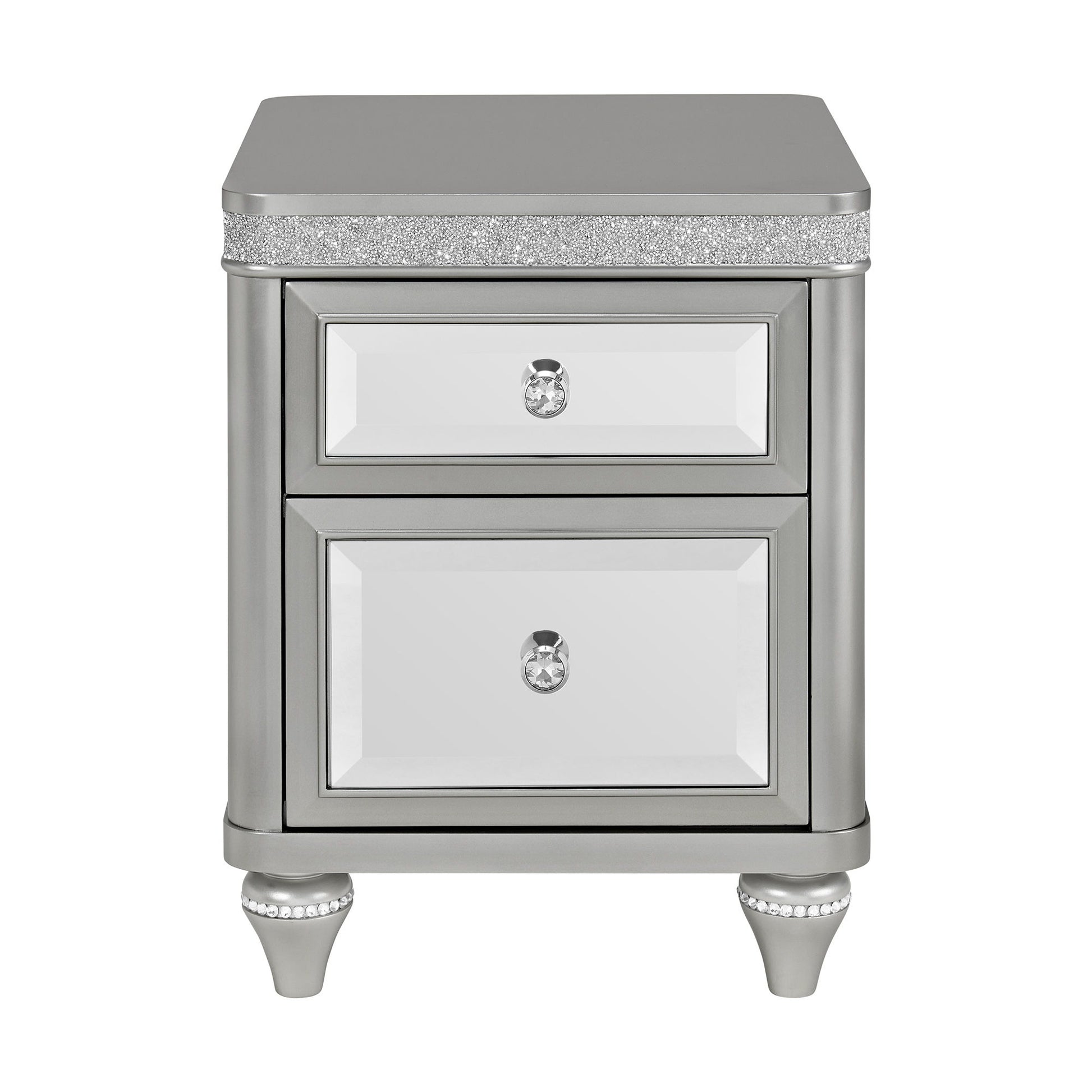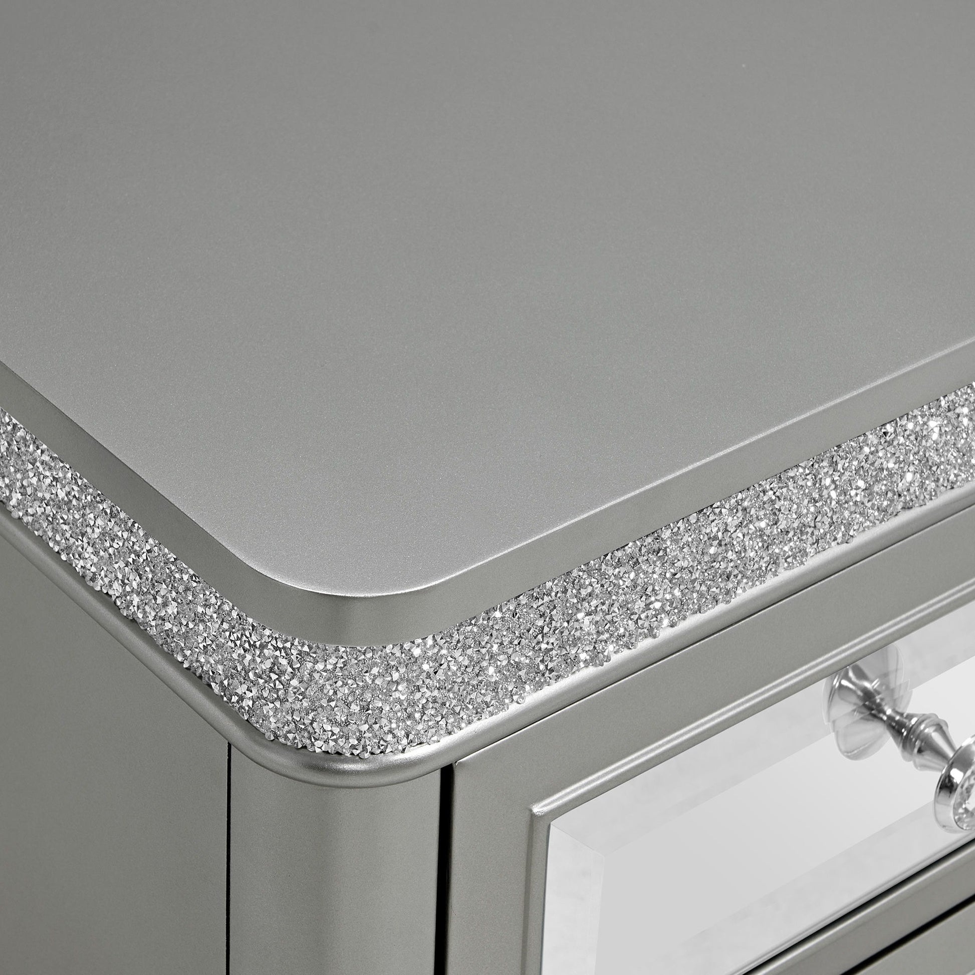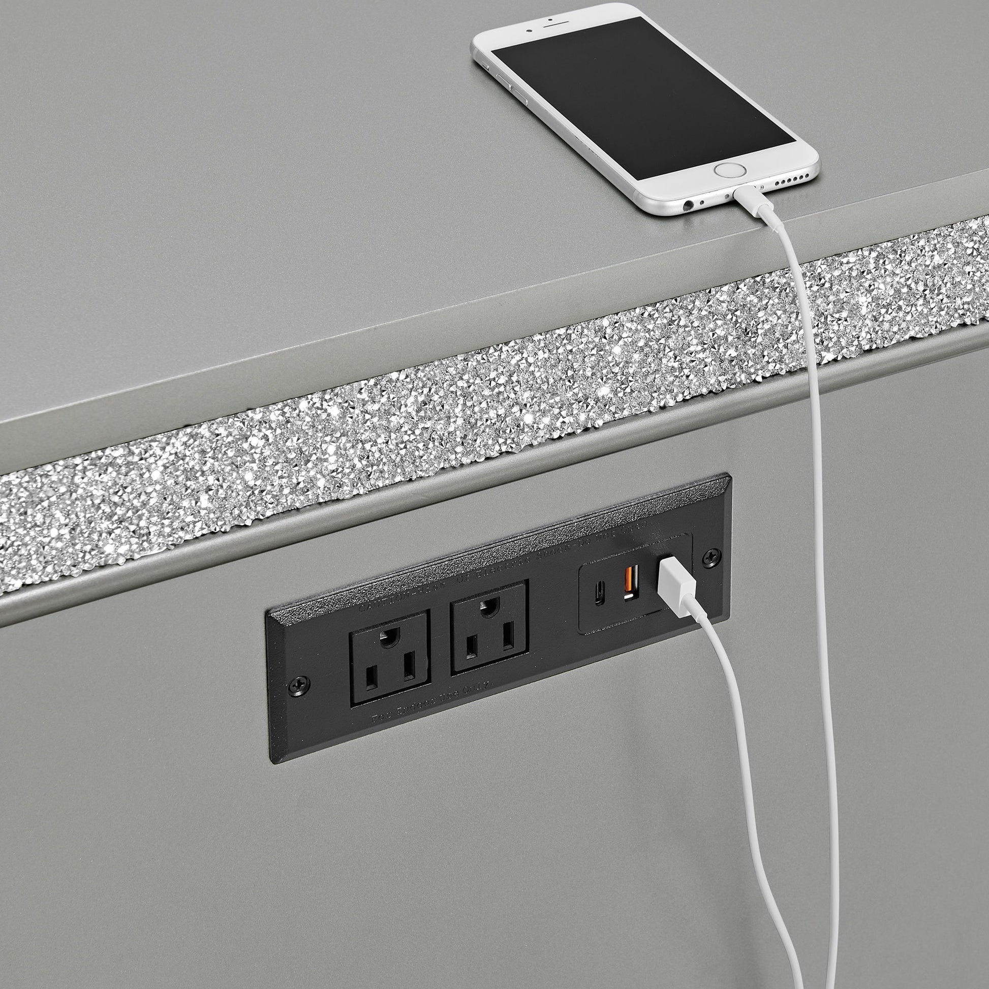 Accent your living space with the glamourous style of the Avril Chairside Table with Power Port. Accented with mirror plates and posh crystal knobs, the two drawers are constructed with skillful dovetailing and ball bearing glides. A convenient power port is implemented to simplify charging electronics and reduce the clutter caused by cables, while bun feet decorated with rhinestones and a glitter trim adorning the table’s perimeter elevate its visual appeal. Designed for those seeking to add an elegant touch of luxury to their space, the Avril Chairside Table with Power Port is just right.
