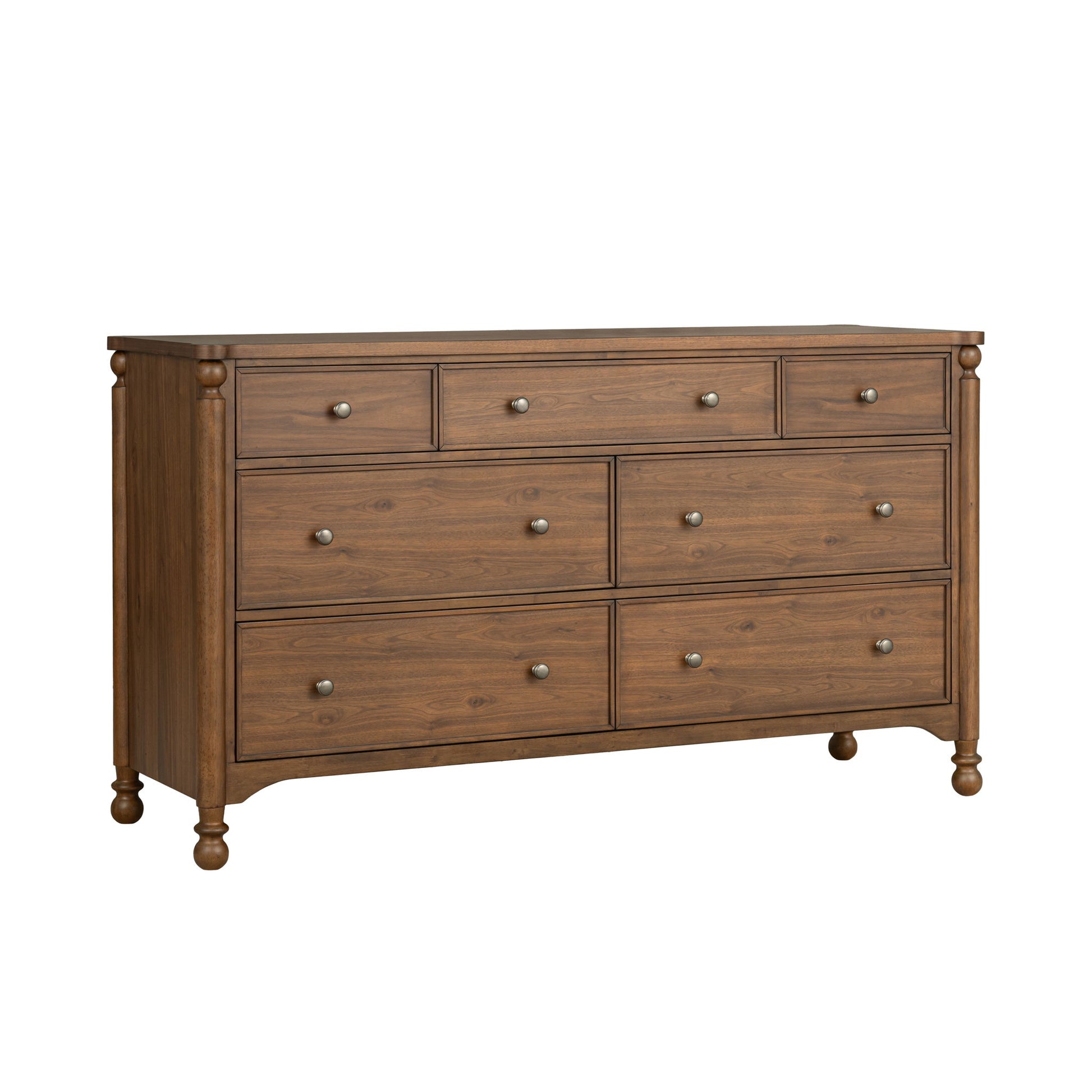 The Azalea dresser is rooted in new traditional style, featuring classically designed picture frame drawer fronts and turned legs with finial details. Crafted from rubberwood solids with walnut veneers, the dresser is finished in a rich Legacy Walnut tone that adds depth and warmth. Designed with generous storage and soft-close functionality, this piece offers an organized, refined solution that supports everyday living while maintaining the collection’s timeless appeal.