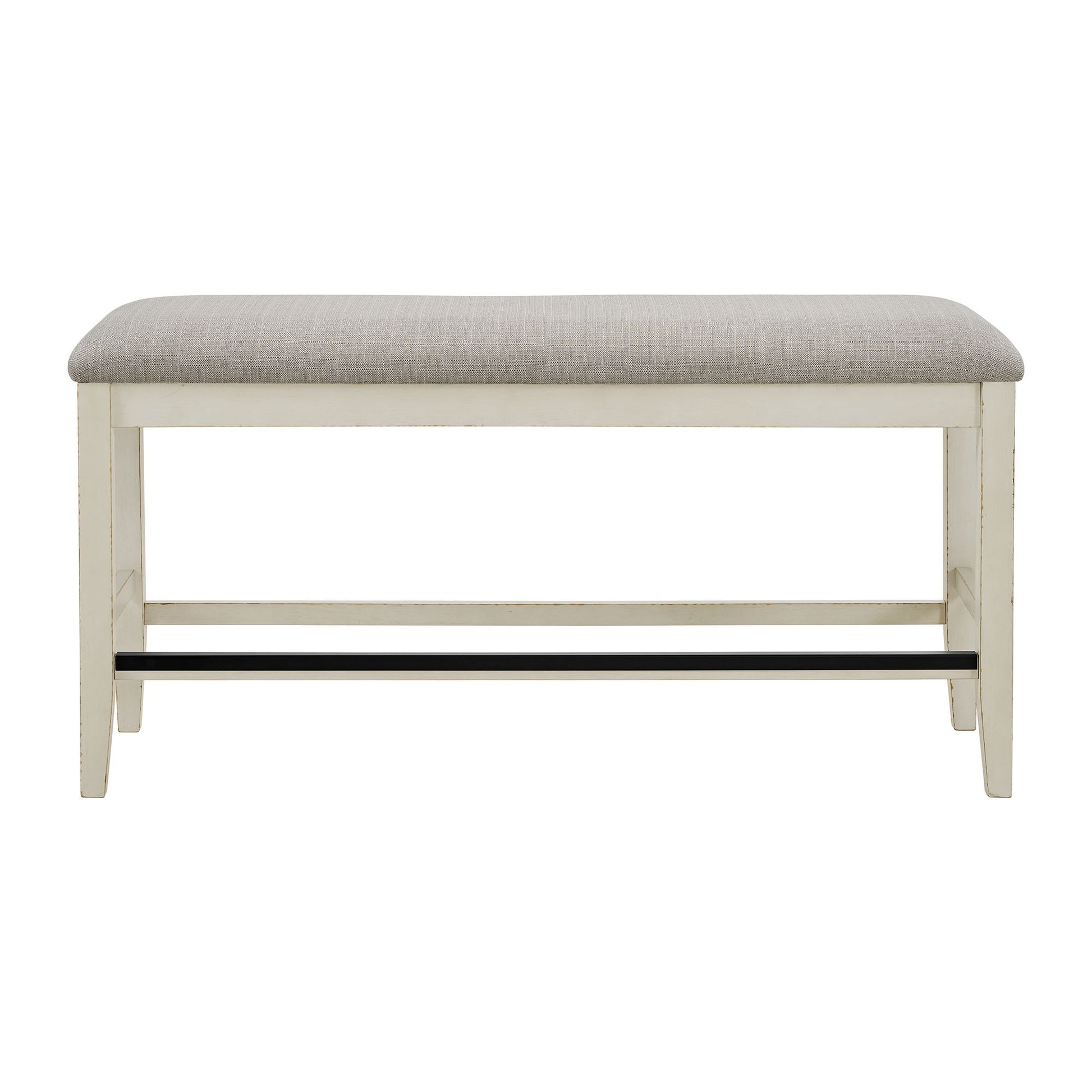 Enhance your dining experience with the Bellevue Counter Bench. It is constructed of rubberwood with distressed edges for a rustic look. The foam cushion upholstered seat provides both comfort and style to your dining area. With stretchers for added stability, this counter bench is not only beautiful but also durable. Bring a touch of farmhouse charm to your home dining experience with a Bellevue collection piece today!