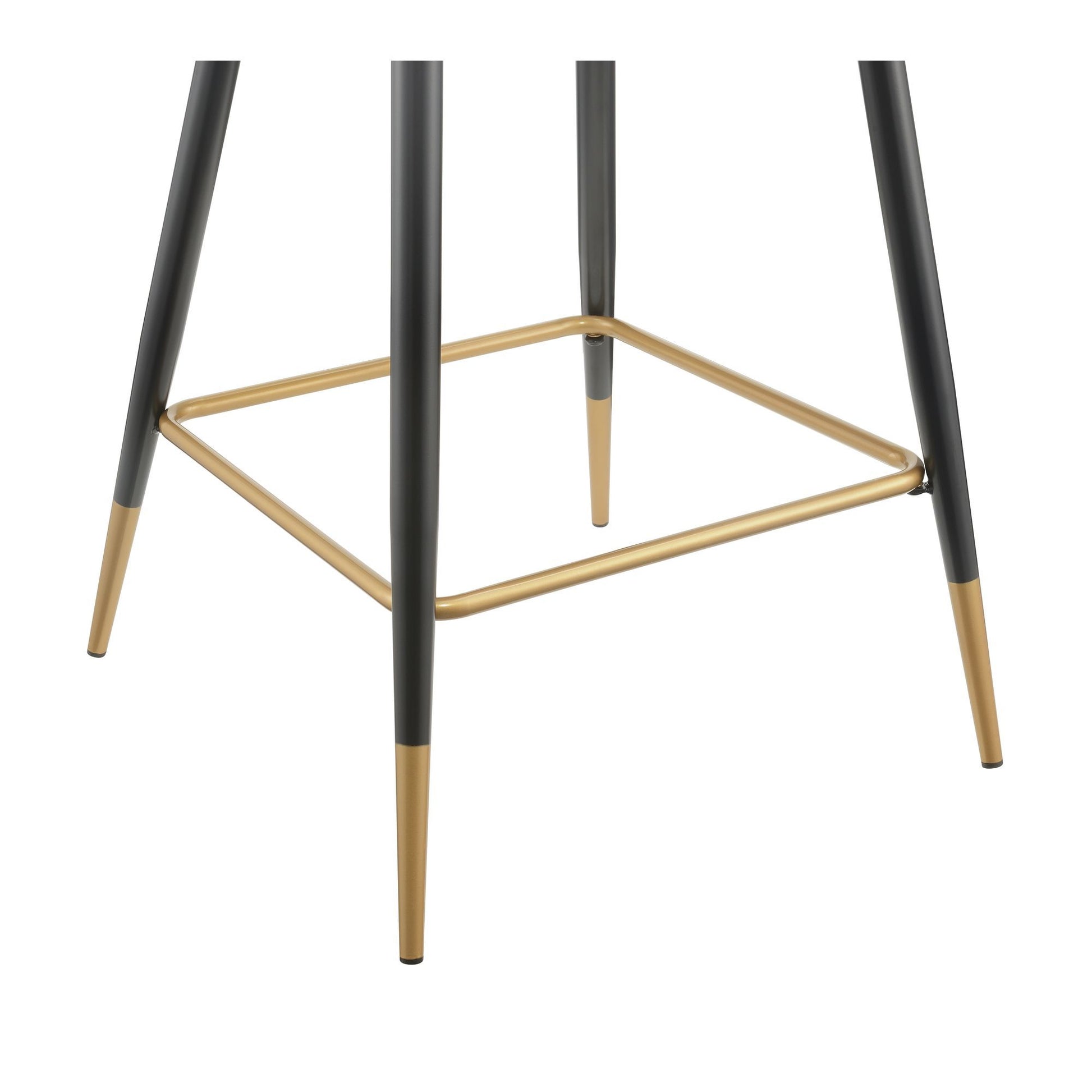 The Ben creates the luxurious dine-in experience your kitchen is missing. Pull up to your home bar or kitchen island in style. Up top, the bar stool is fully upholstered in soft, polyester with a high, slightly curved back. The seat is filled with foam for enhanced all day comfort. Down below, the base is constructed of black metal legs with gold tips creating a snazzy accent. Enjoy your next cocktail or meal in style with the Ben Bar Stool. Includes two bar stools that ship in one convenient box.