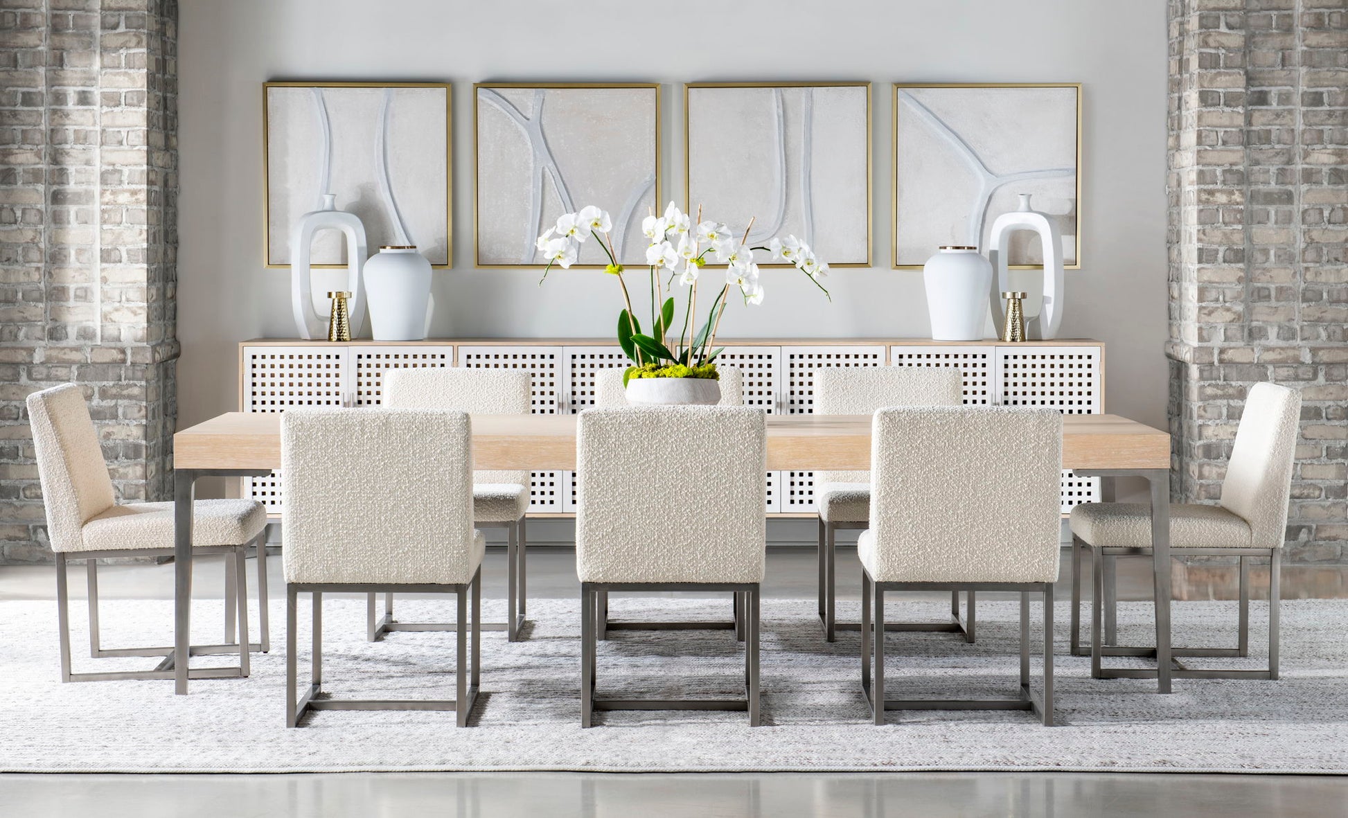 Capture a modern resort feeling with the Biscayne Collection by Legacy Classic - Modern. A light and airy blonde Malabar finish is paired with faux woven raffia,, alabaster doors,, and boucle fabrics for a serene and stylish setting.