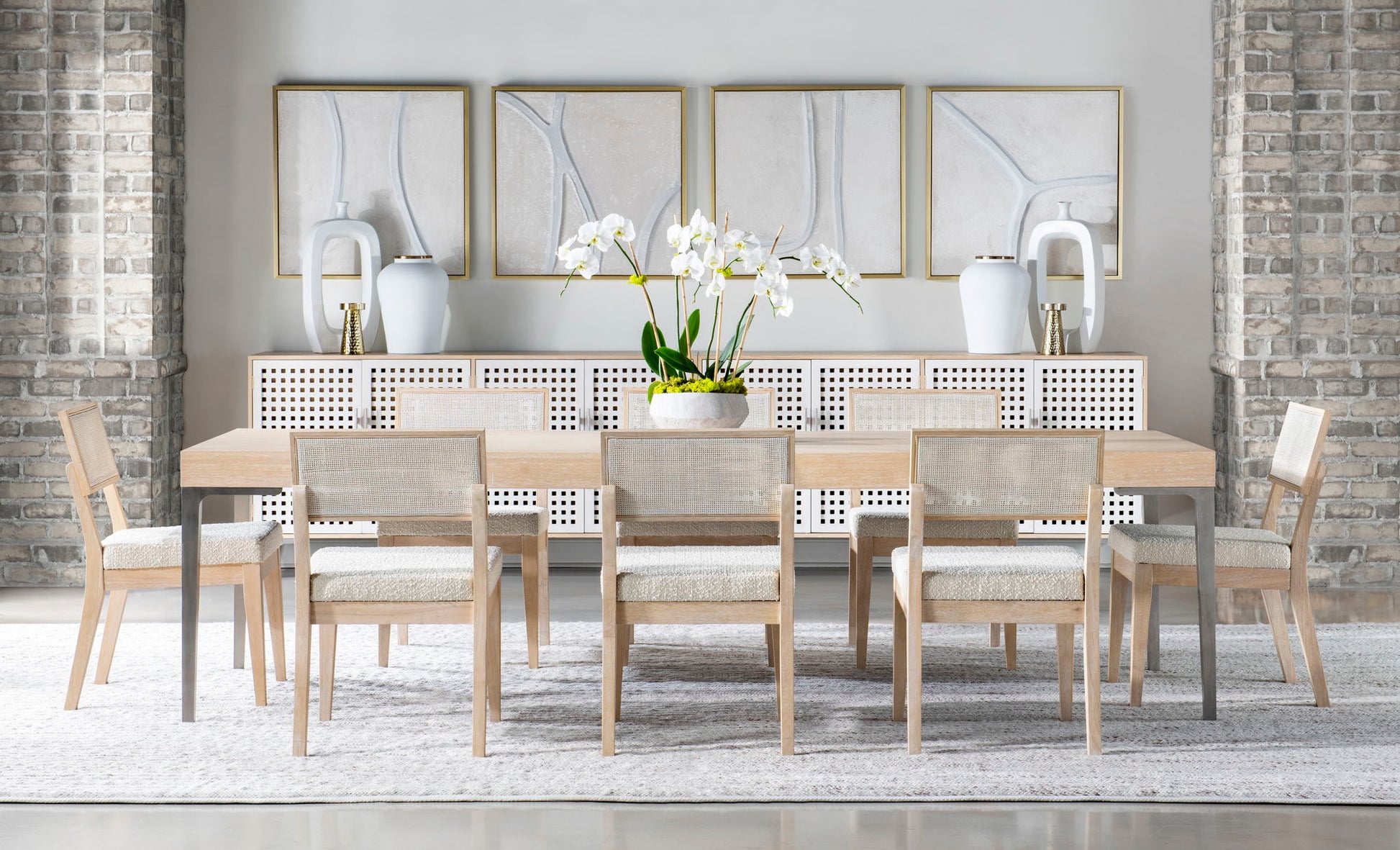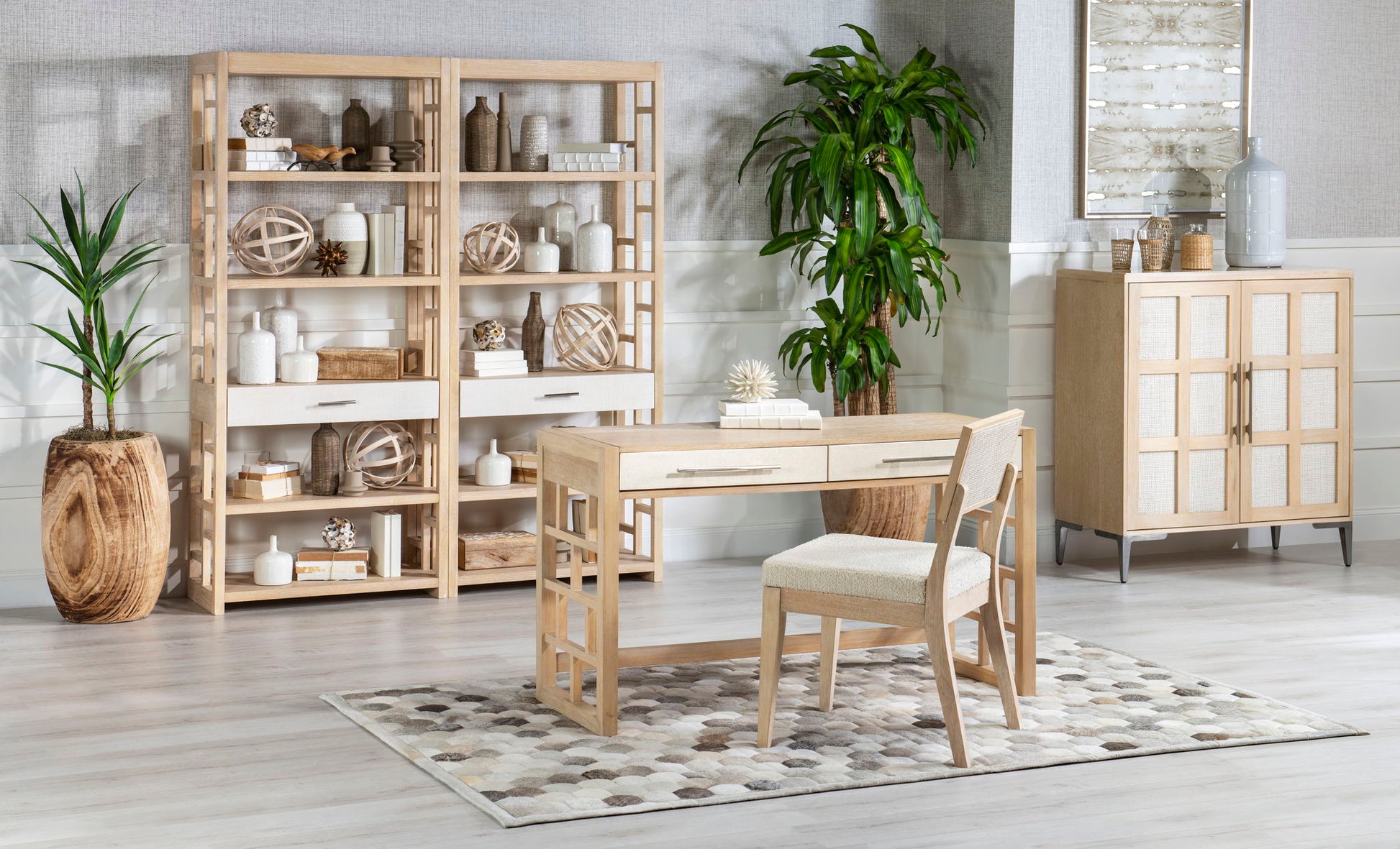 Capture a modern resort feeling with the Biscayne Collection by Legacy Classic - Modern. A light and airy blonde Malabar finish is paired with faux woven raffia,, alabaster doors,, and boucle fabrics for a serene and stylish setting.