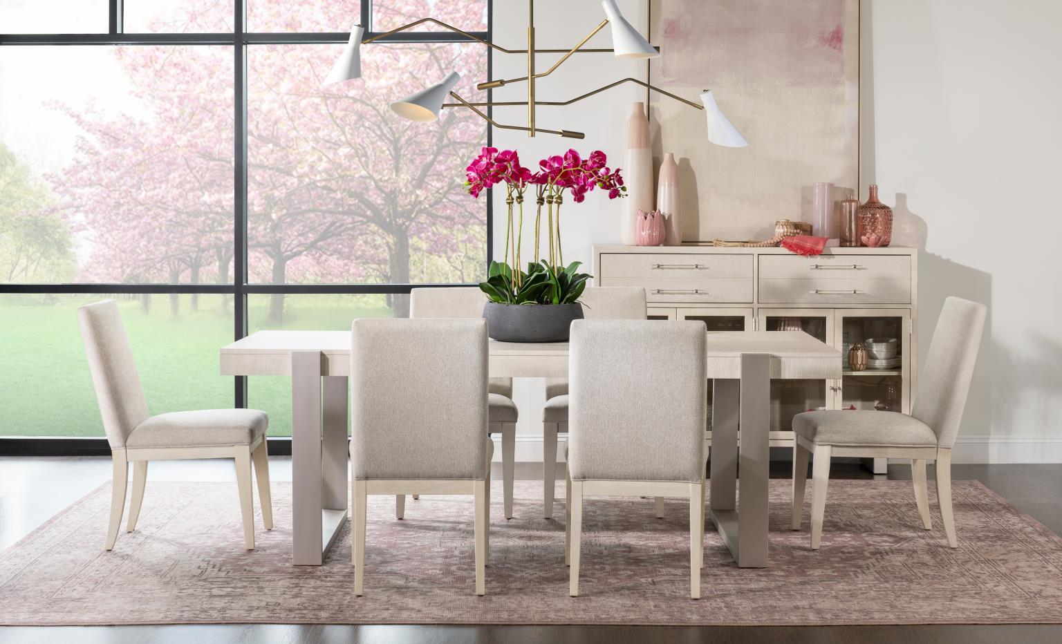 Bliss is a casual contemporary collection offering bedroom,, dining,, and occasional options. A beautiful mixture of finishes on modern silhouettes gives the group a unique styling with a touch of glam. A Soft Cashmere finish on Quartered Oak in eye-catching veneer patterns mixed with Champagne colored accents adds a high-end look. Clear acrylic hardware finishes off each piece. Simple forms and straight lines add to the more contemporary tone.