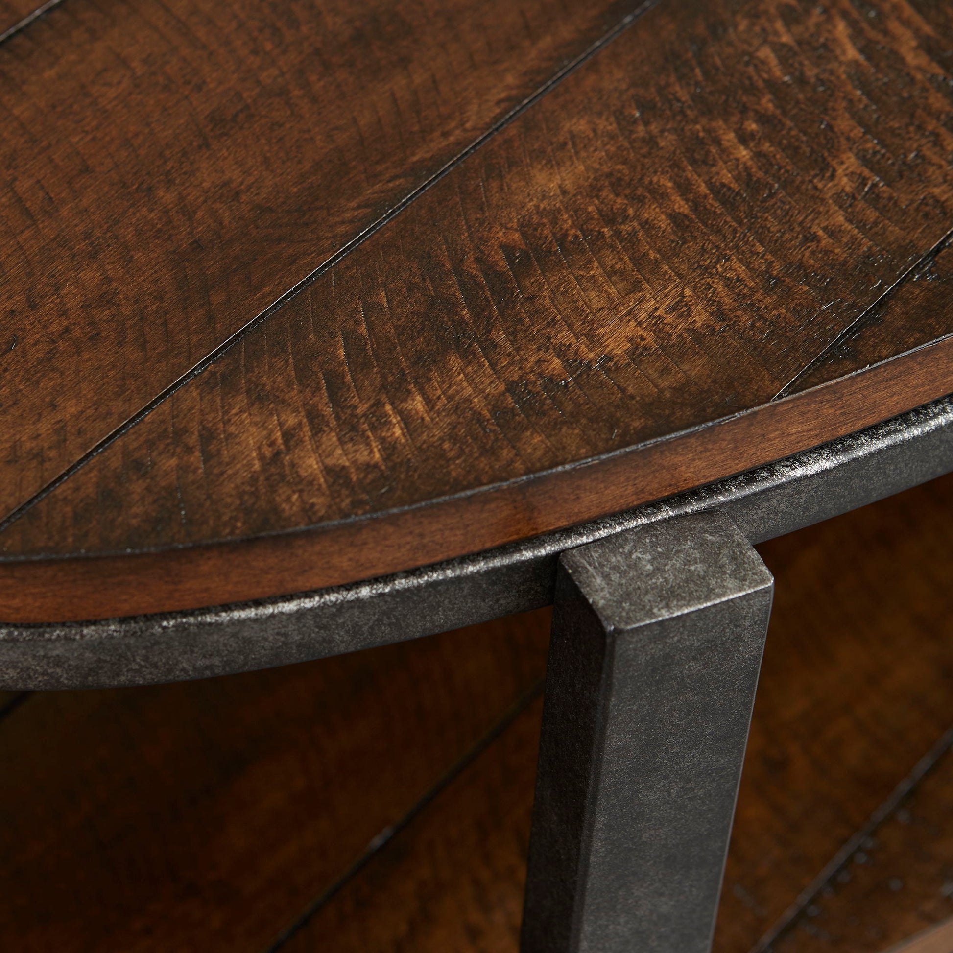 Elevate your space with the rustic style Breckenridge demilune sofa table. Crafted of metal tube and poplar veneers, this piece features a mahogany spice finish with pewter metal accents, appealing chattered planked top, a planked bottom shelf for additional storage, anchored by squared tube metal legs connected to a metal X stretcher. This simplistic style sofa table would be a wonderful accent piece in any home.