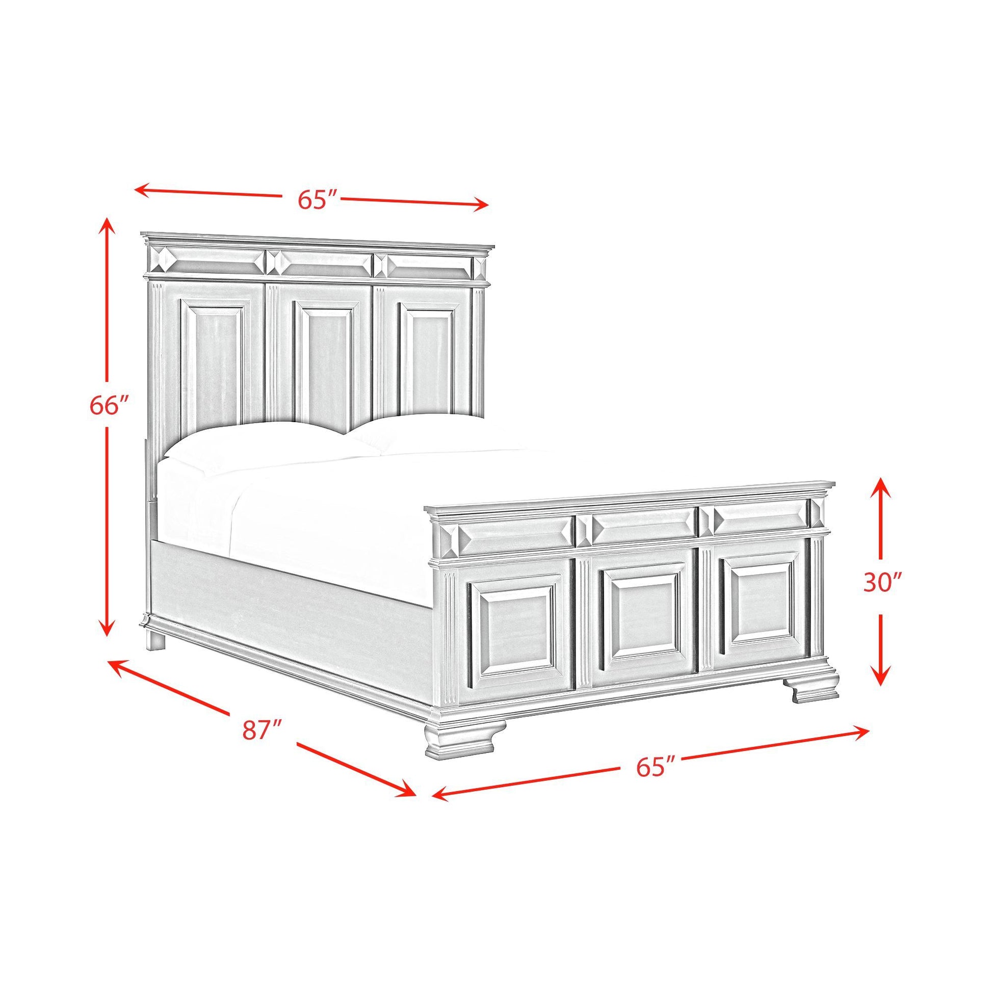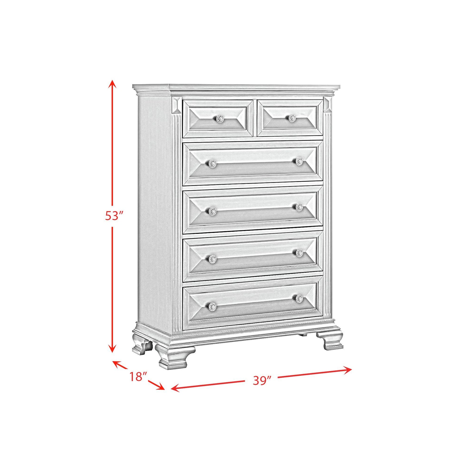 Create a luxurious and stunning bedroom with the Bridgestone Panel Bedroom Set. The three-panel headboard and footboard add visual interest, while the platform bed includes four slats and eight supports for added durability. Enjoy the convenience of metal knob hardware, top drawers with felt lining, bottom drawers with cedar veneer, and ball bearing drawer guides for smooth operation. For safety, the chest includes an anti-tipping kit. Upgrade your bedroom decor with the traditional and sophisticated Bridgestone Bedroom Set.