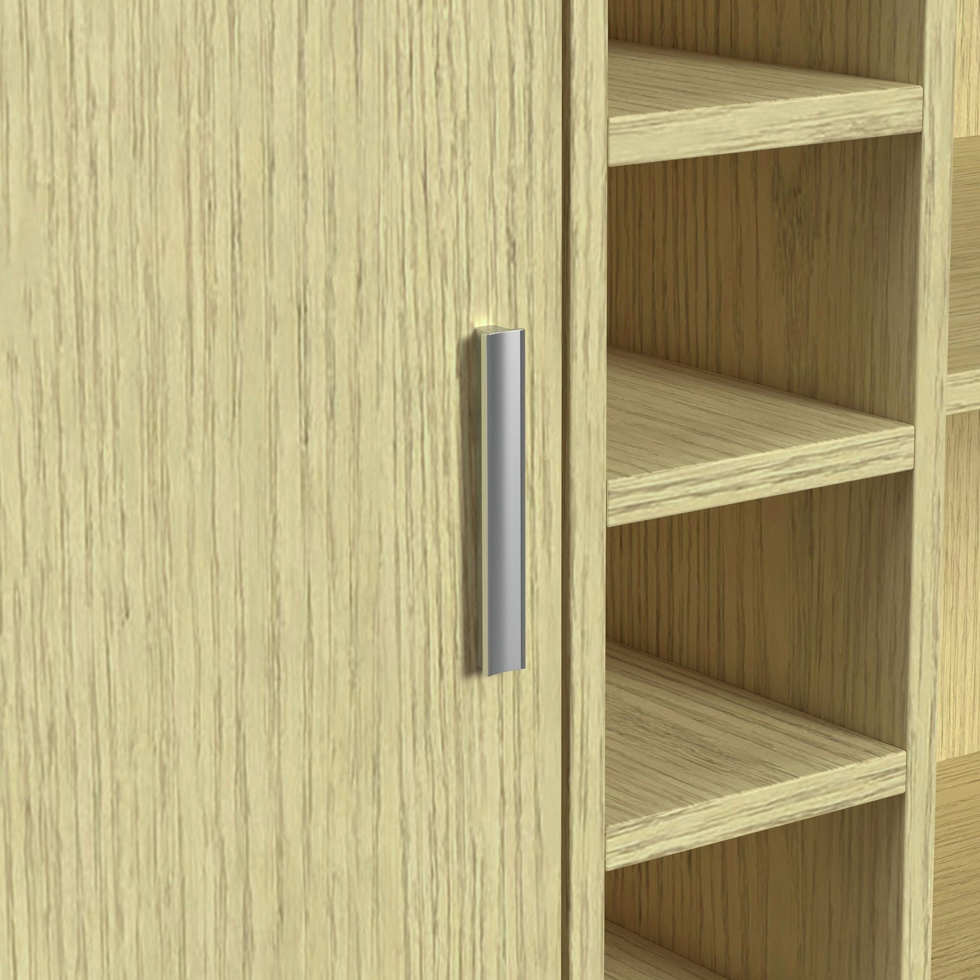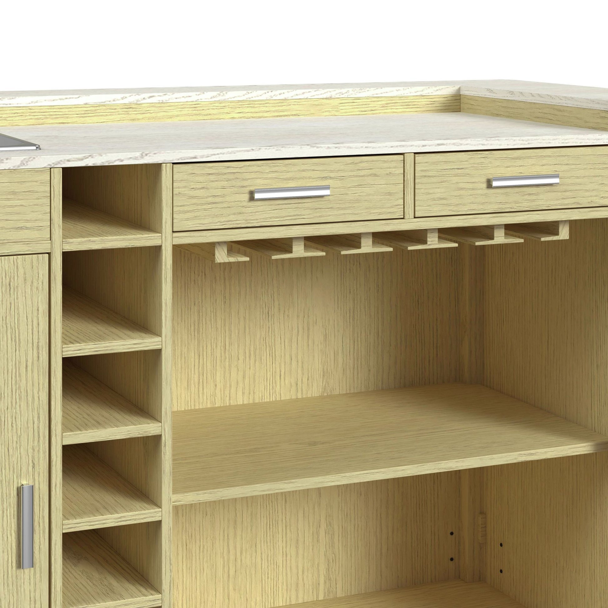Define your dining room with the versatile Cambrie Bar Table. Its clean, natural finish creates a warm, inviting atmosphere, perfectly complementing the fine grain detailing and fluted sides. Expertly crafted with thoughtful features, this piece includes open shelving, wine racks, glass holders, and dovetailed drawers with smooth ball-bearing glides. Sleek, silver hardware adds a touch of sophistication, while the solid wood construction and high-quality oak veneer ensure lasting quality. Embrace the elegant design of the Cambrie Bar Table, a perfect blend of understated style and practical functionality.