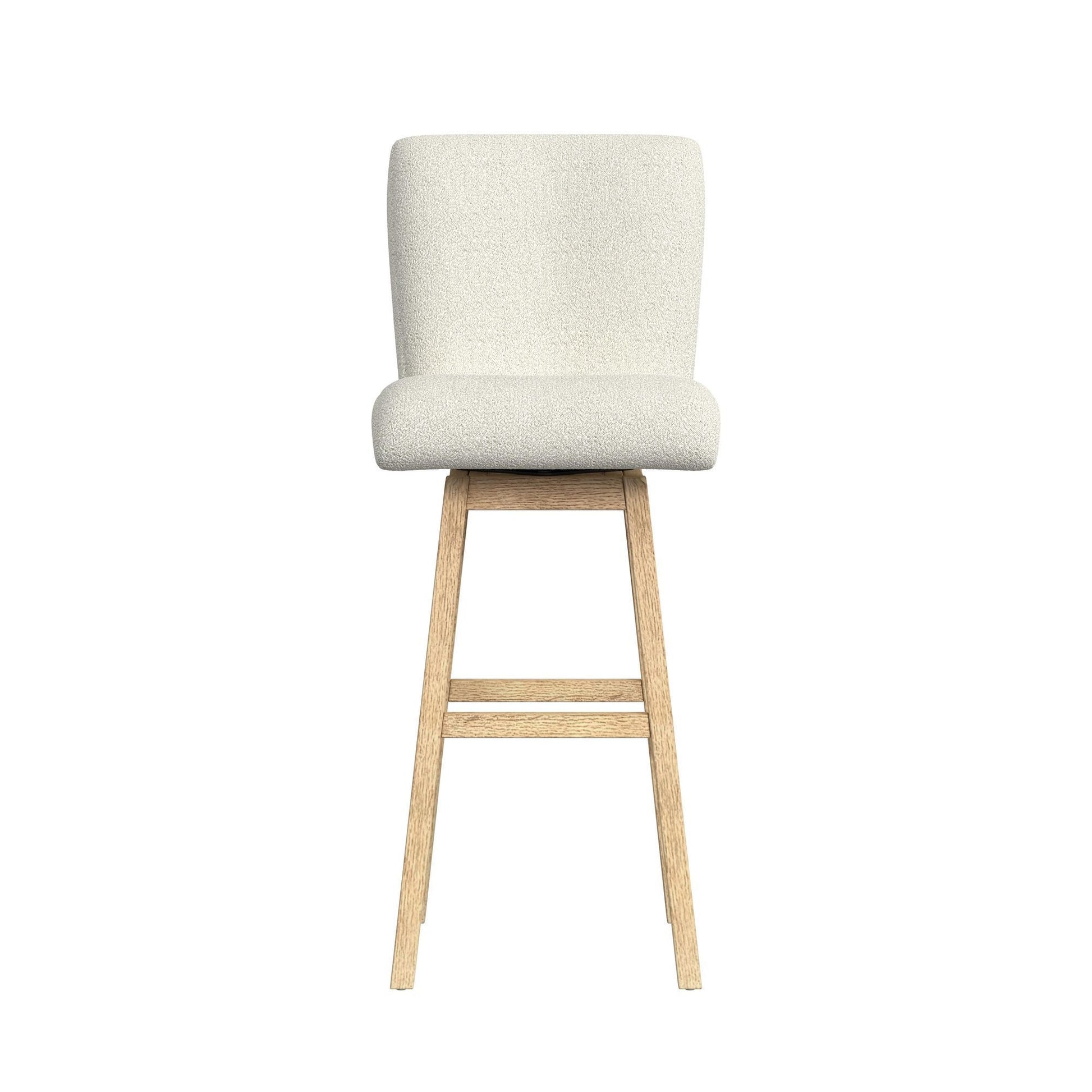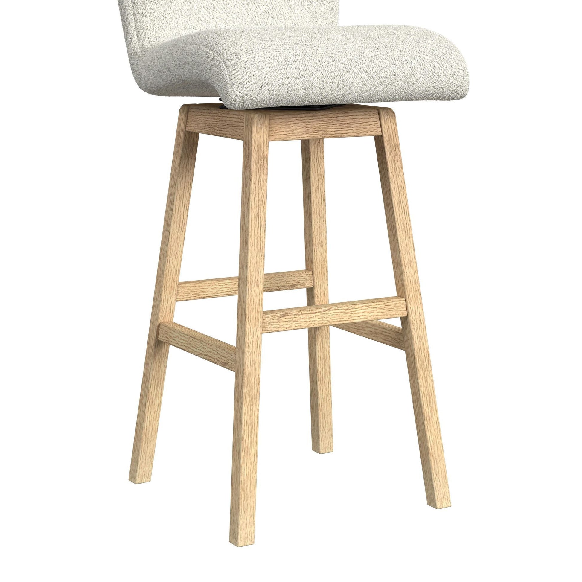 The Cambrie Upholstered Swivel Barstool accents your dining space with its uniquely modern style. The frame's clean, natural finish creates a warm, inviting atmosphere, perfectly complementing the neutral upholstery's soft, boucle texture. Crafted with thoughtful detail, this piece features a backrest with gracefully subtle curved lines, durable solid wood construction ensuring lasting quality, and quintessential swivel motion to ease movement. Embrace the elegant design of the Cambrie Upholstered Swivel Barstool, a perfectly curated blend of modern style and practical functionality.