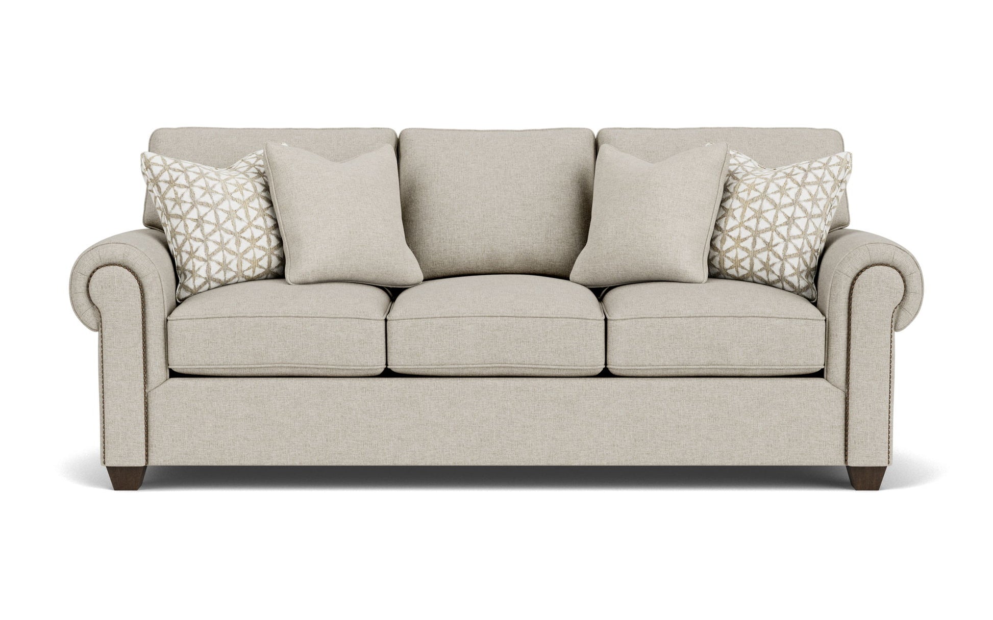 Dramatic characteristics on a bold frame. A unique wrap-around padded armrest on Carsons large-scale rolled arm is highlighted with pleats and welt cording. Optional nailhead trim tightly spaced lines the exposed arm fronts for a fun, visual effect. Relax into Carsons overstuffed seat and back cushions after a long day and feel the stress melt away.