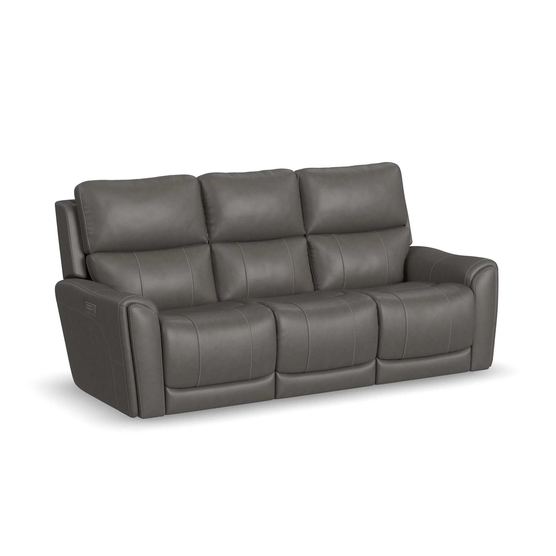 Power up and enjoy secretive perks with the Carter power reclining sofa. Customize your comfort with adjustable recline, headrest and lumbar support on each end seat, including reclining to a Zero Gravity position for a weightless experience, reducing pressure on joints. This sofa will be a statement in your home with its genuine leather look that is a durable, easy to clean fabric in a cappuccino brown color, and Flexsteel's patented Blue Steel Spring™ at the heart of each seat for ultimate durability. Flared arms, a contoured seats and heavy thread stitching details give it a sleek, yet striking look. And it all comes with discreet storage perks, including pop-out cupholders in the arms and a flip-down center cushion that reveals a storage console, touch lighting and a wireless charging pad.