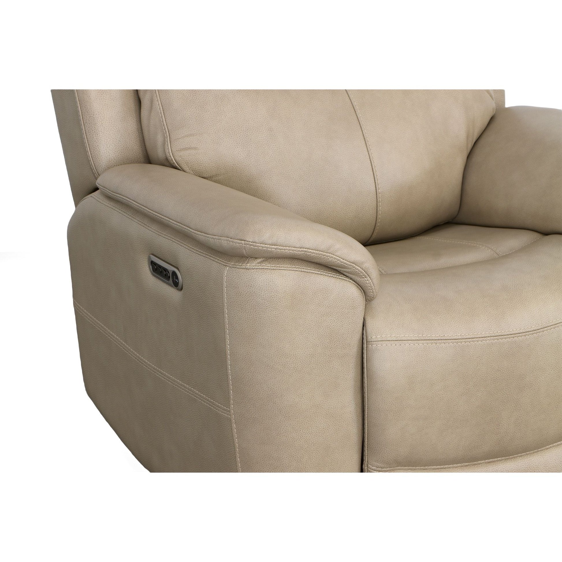 Superior ergonomics combine with the plush comfort of the Crew leather power recliner. Featuring triple power functionality that allows for independent adjustment of the headrest, lumbar support and recline, this recliner also features Zero Gravity which reduces pressure and tension on the body. Enjoy reliable comfort all day, every day, with pad-over armrests, a waterfall chaise footrest, a thin layered headrest, and divided back cushion. Built-in USB ports conveniently keep mobile devices charged and ready to stream your favorite shows. With Flexsteel's patented Blue Steel Spring™ at the heart of the seat, and high-quality light tan leather, the Crew power recliner brings exceptional beauty and durability to your home.