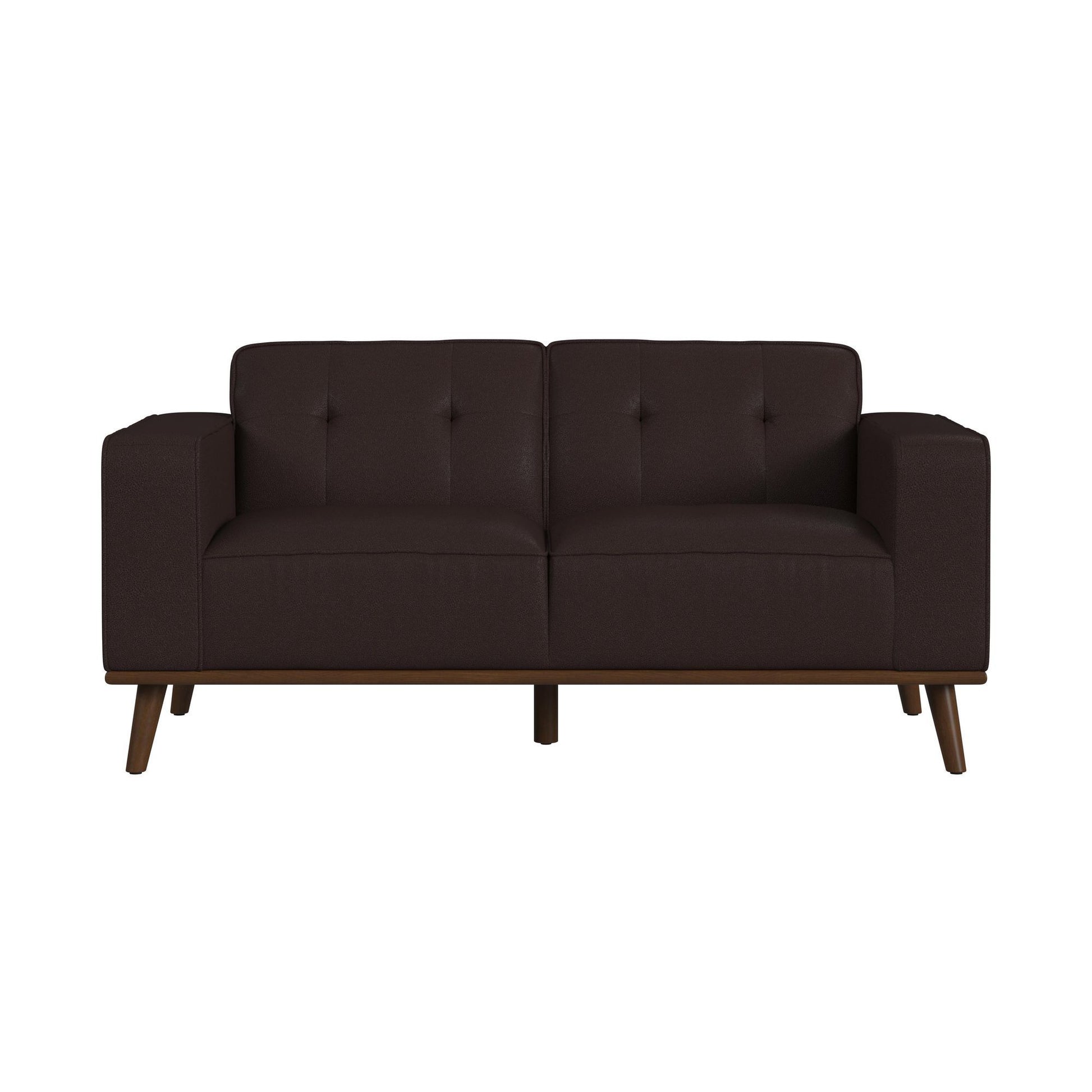 The Destiny Loveseat with Wood Front exudes the coveted charm of mid-century modern style. Built with framing of quality solid and engineered wood that is full upholstered in quality faux leather, this piece is built for durability. Comfortable foam cushioning, decorative tufting on the backrest, and track arms forming sleek and modern lines culminate to mark thoughtful design, while an exposed front rail and wood legs highlight excellent craftsmanship. For a refined and sleek addition to your living space, the Destiny Loveseat with Wood Front delivers in quality and style.