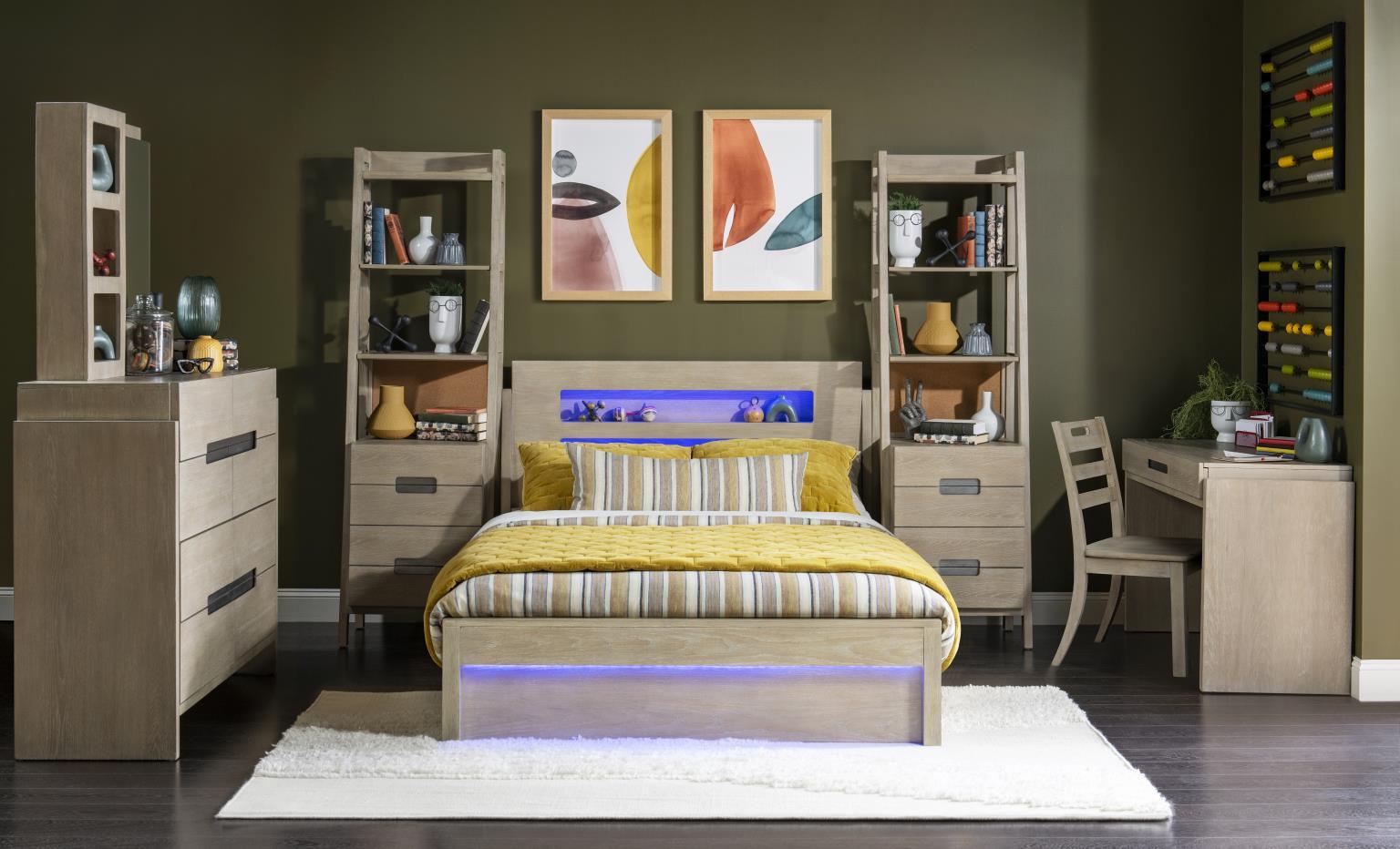 Clean contemporary forms and multi-functional pieces create the energetic District collection by Legacy Kids - Teens. The collection is crafted of Straight Grain, White Oak with a Weathered Oak finish and accented by rustic pewter hardware. A focal-point piece is the Captain's Bed, combining the functions of sleep, study, and storage in a compact footprint. Below the elevated bed are 4 drawers and a trundle, along with 2 pull-out work surfaces. All sizes of the panel beds have inset headboards and footboards with lighting operated by remote control or an app that can be downloaded, allowing children and teens to control lighting colors, patterns, and intensity, and even to program lighting to correspond to the rhythms of the music.