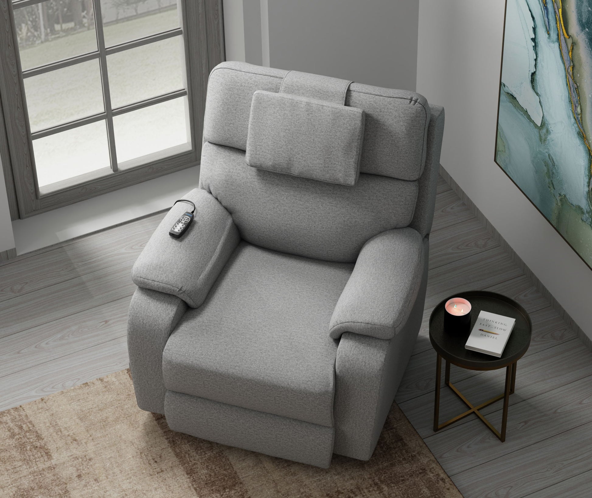 Dreamtime is a Health&Wellness Station item featuring our Power Headrest and a new memory foam adjustable neck pillow for ultimate comfort. This Power Recliner offers the benefits of CR3 Heat & Massage, Zero Gravity recline, and Nanobionic Performance Fabric and is available in your choice of three colors: Beach, Haze or Steel.