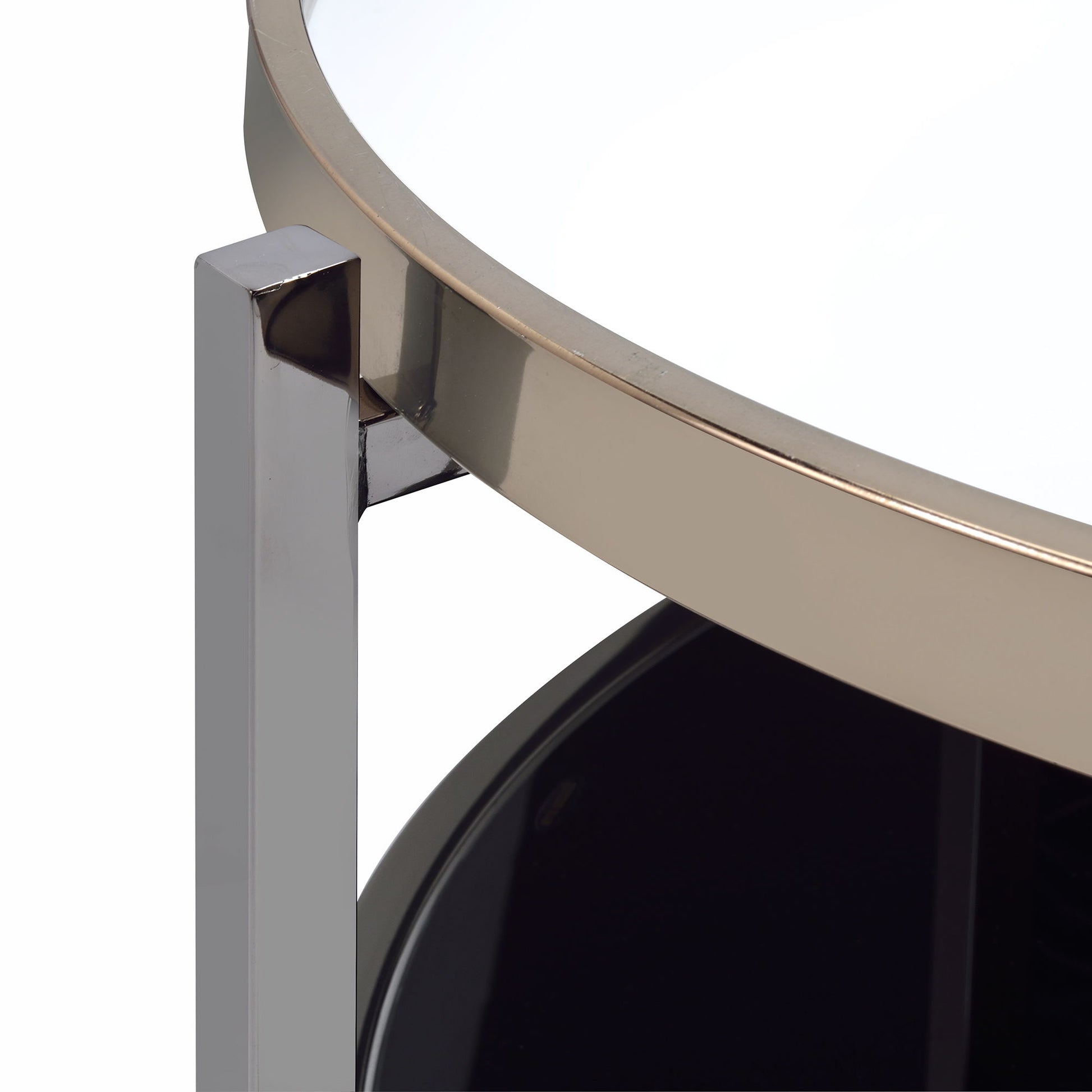 The Edith 2PC Occasional Table Set is the perfect addition to your home! This duo comes with a coffee table and end table, creating the ideal living space. This set features a mirrored table top, that is also tray like. The table top edge is finished in a gold, while the legs are in a dark nickel. The bottom shelf on the coffee table is perfect for storing away any books and magazines, or it can easily be used to display your favorite decor. The end tables base features stretchers to provide extra stability, without losing style. Add this duo to your home today!