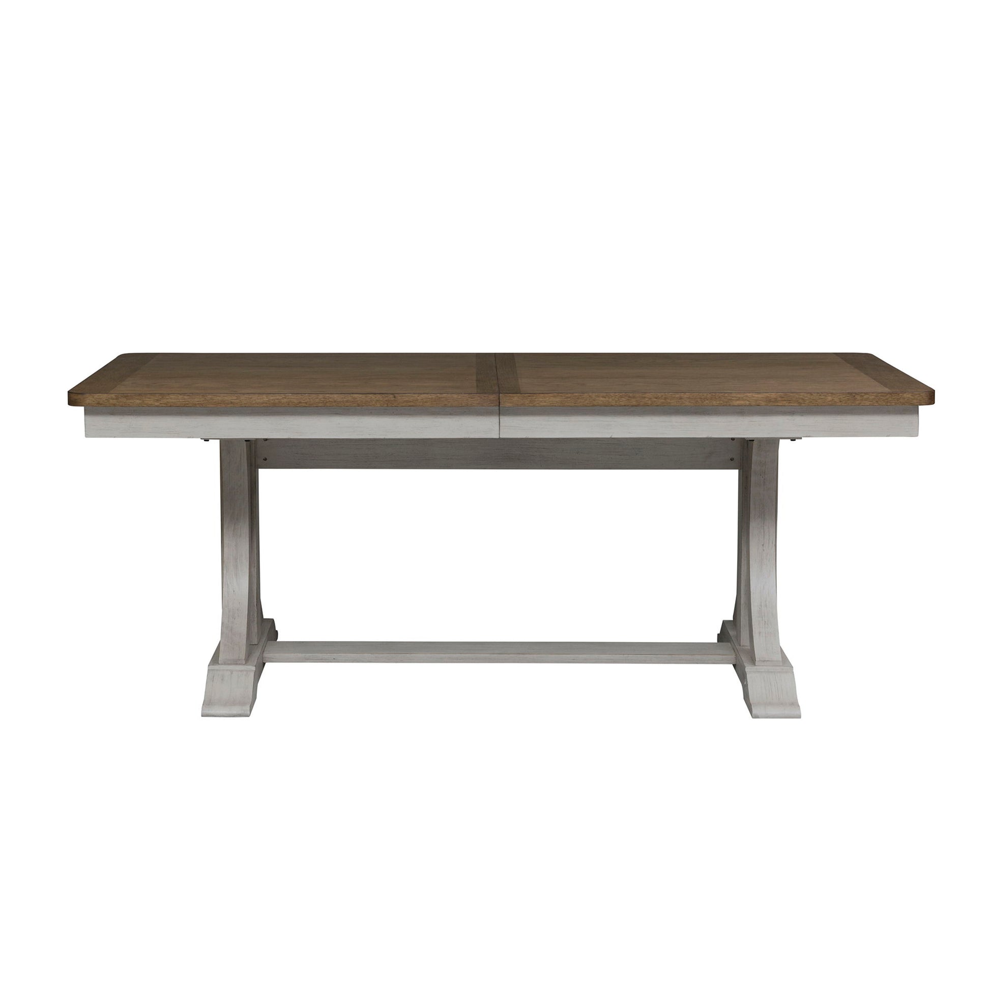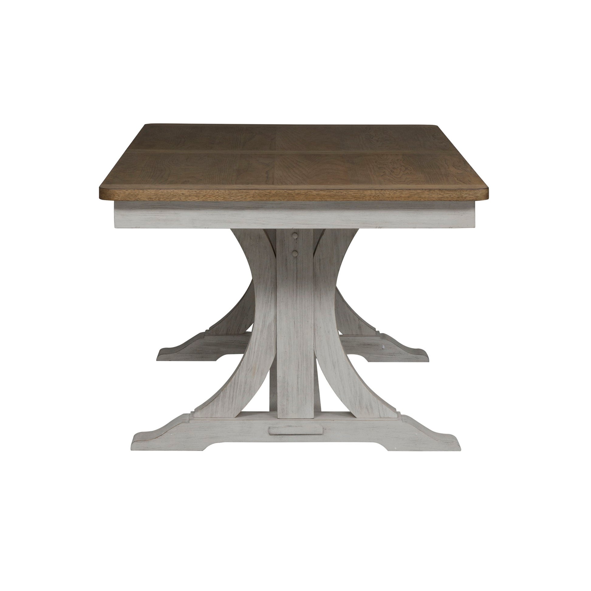 Crafted of pine solids and veneers, the Farmhouse Reimagined trestle table base features an antique white finish with heavy wire brushing. This trestle table base has shaped legs that flow into a straight trestle adding dimension and design appeal. Pair this base with the Farmhouse Reimagined trestle tabletop to wow family and friends. Farmhouse Reimagined offers cottage styles you love with a heavily distressed finish that will work from the beach to the mountains to an industrial loft.