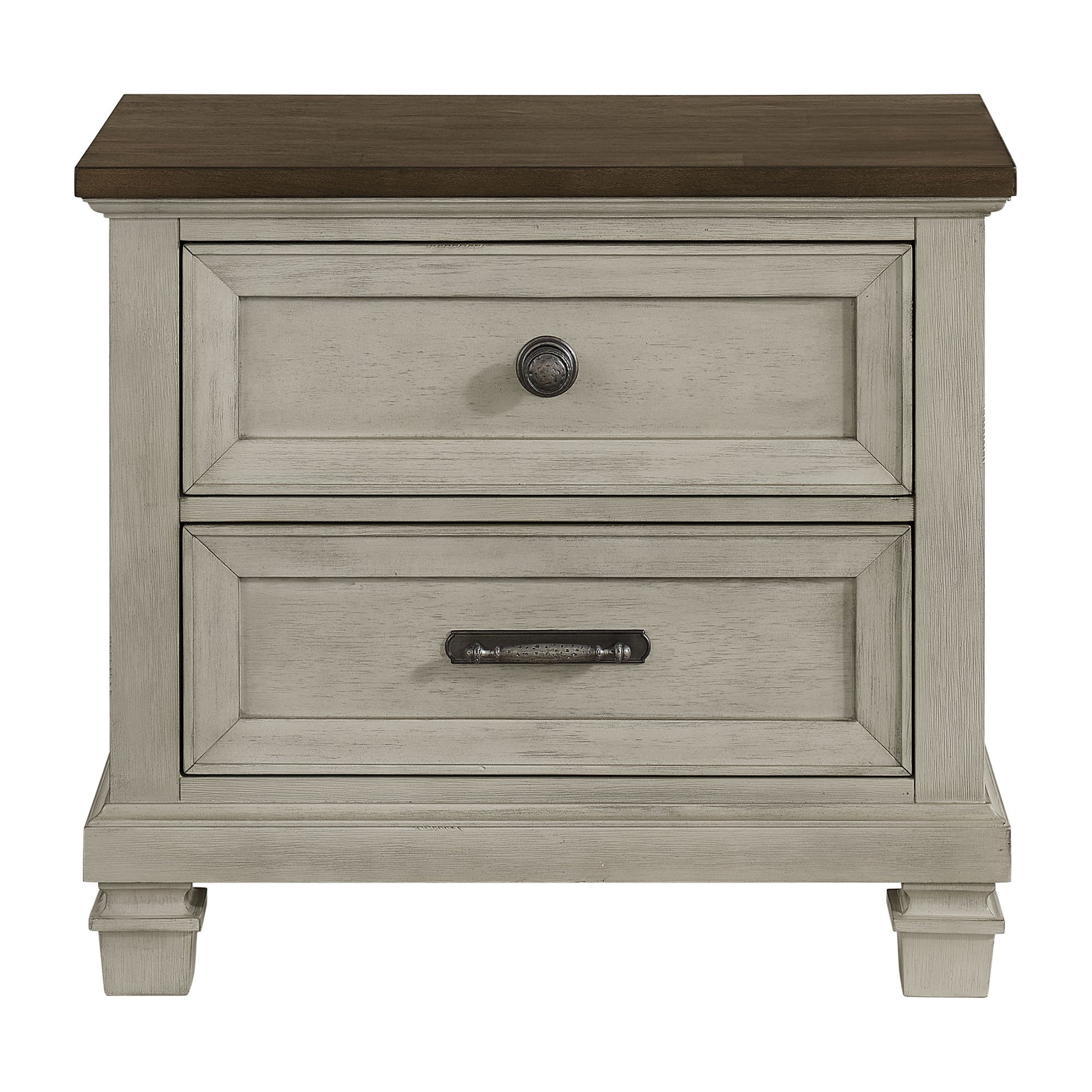 The Farmington 2-Drawer Nightstand is a beautifully designed piece of furniture constructed of poplar wood with acacia veneer. It boats a stylish two-tone design in medium brown and washed stone that will complement any bedroom decor. The nightstand also features a convenient USB port for easy charging, top drawer with brown felt lining, and a cedar lined bottom drawer for ample storage space. Complete with handle and knob metal hardware, ball bearing drawer guide, and French and English dovetail construction, this case piece is not only stylish but also functional. Upgrade your bedroom with the Farmington collection today!