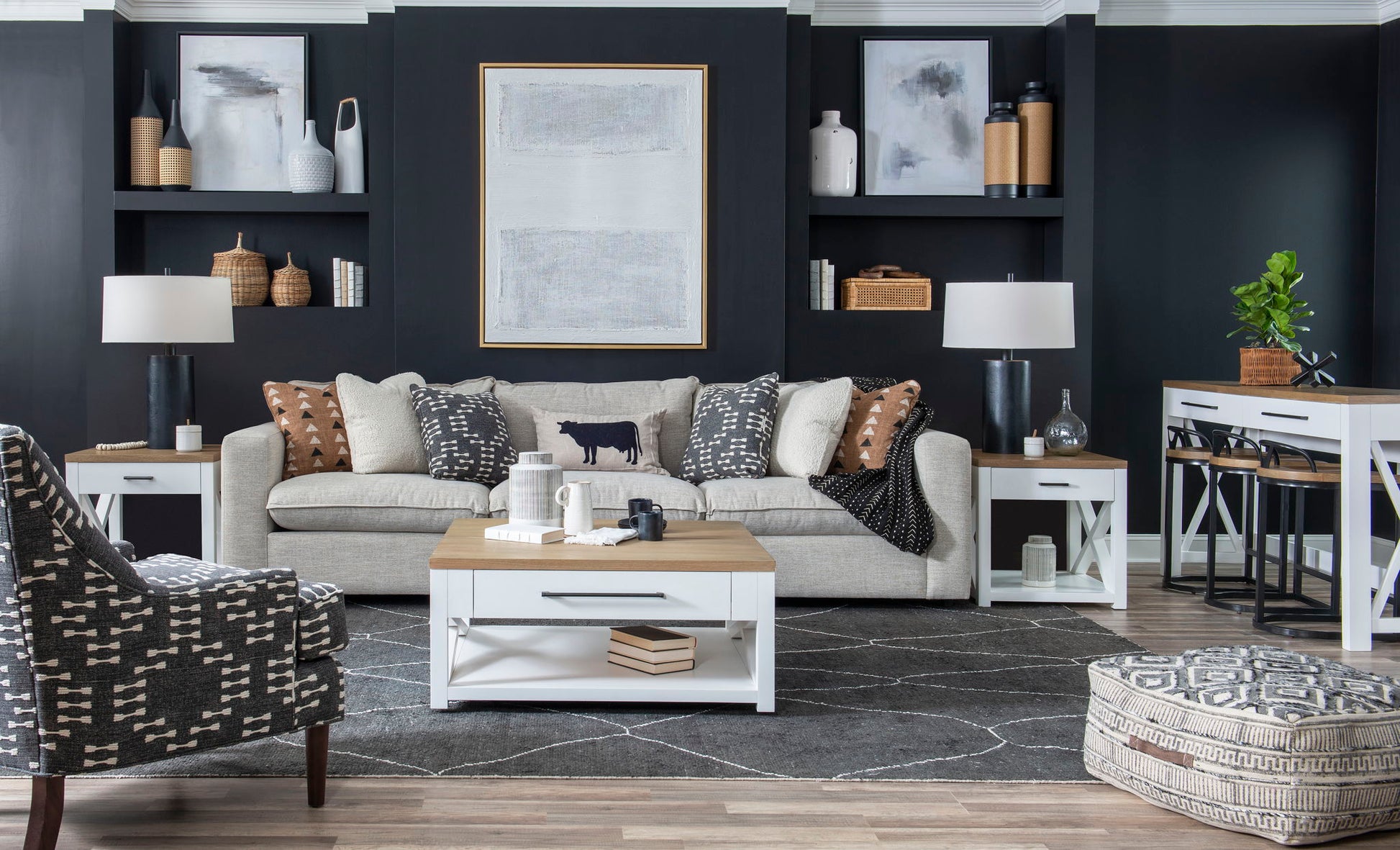 Tactile,, yet refined,, and always modern. Clean lines meld with comfortable textures and tones in our total home collection,, Franklin. Simple farmhouse details such as block feet,, beveled framed drawer fronts,, planking and X motifs create visual interest in a modern way and without feeling too cluttered. Harvest Oak tops on quartered white oak veneer sit atop Natural White painted bases. Select items offered in Aged Black that repeats the finish on hardware and accents.