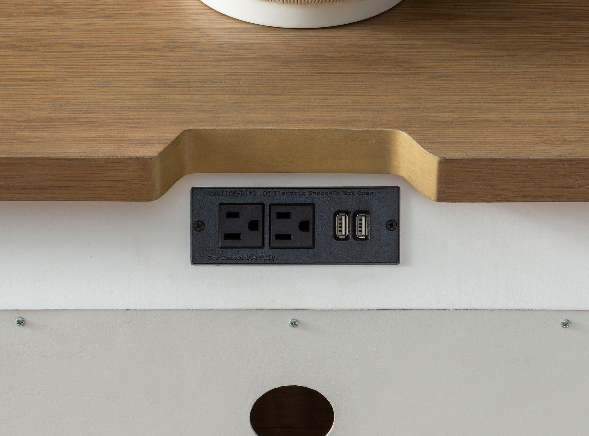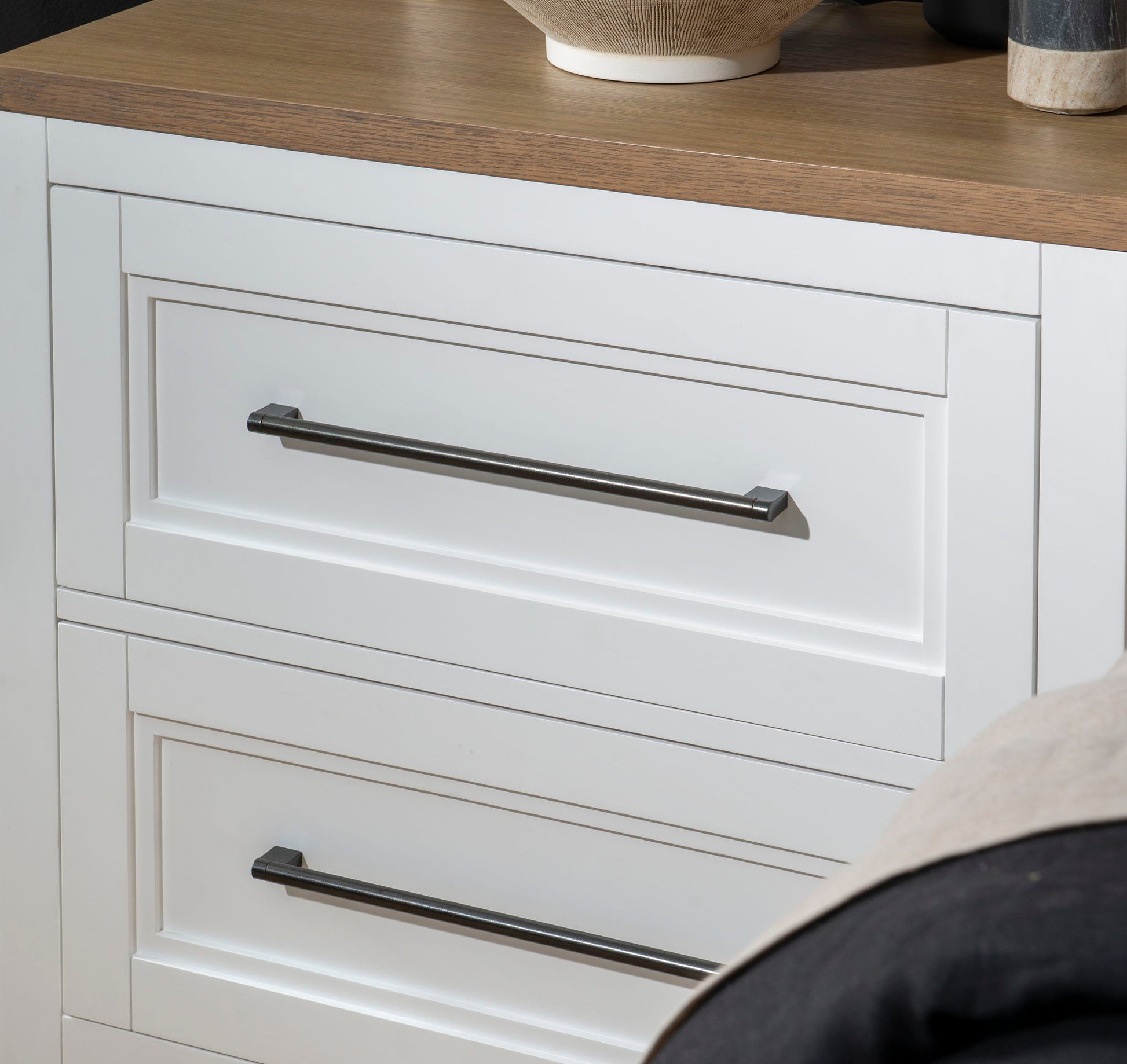 Tactile,, yet refined,, and always modern. Clean lines meld with comfortable textures and tones in our total home collection,, Franklin. Simple farmhouse details such as block feet,, beveled framed drawer fronts,, planking and X motifs create visual interest in a modern way and without feeling too cluttered. Harvest Oak tops on quartered white oak veneer sit atop Natural White painted bases. Select items offered in Aged Black that repeats the finish on hardware and accents.