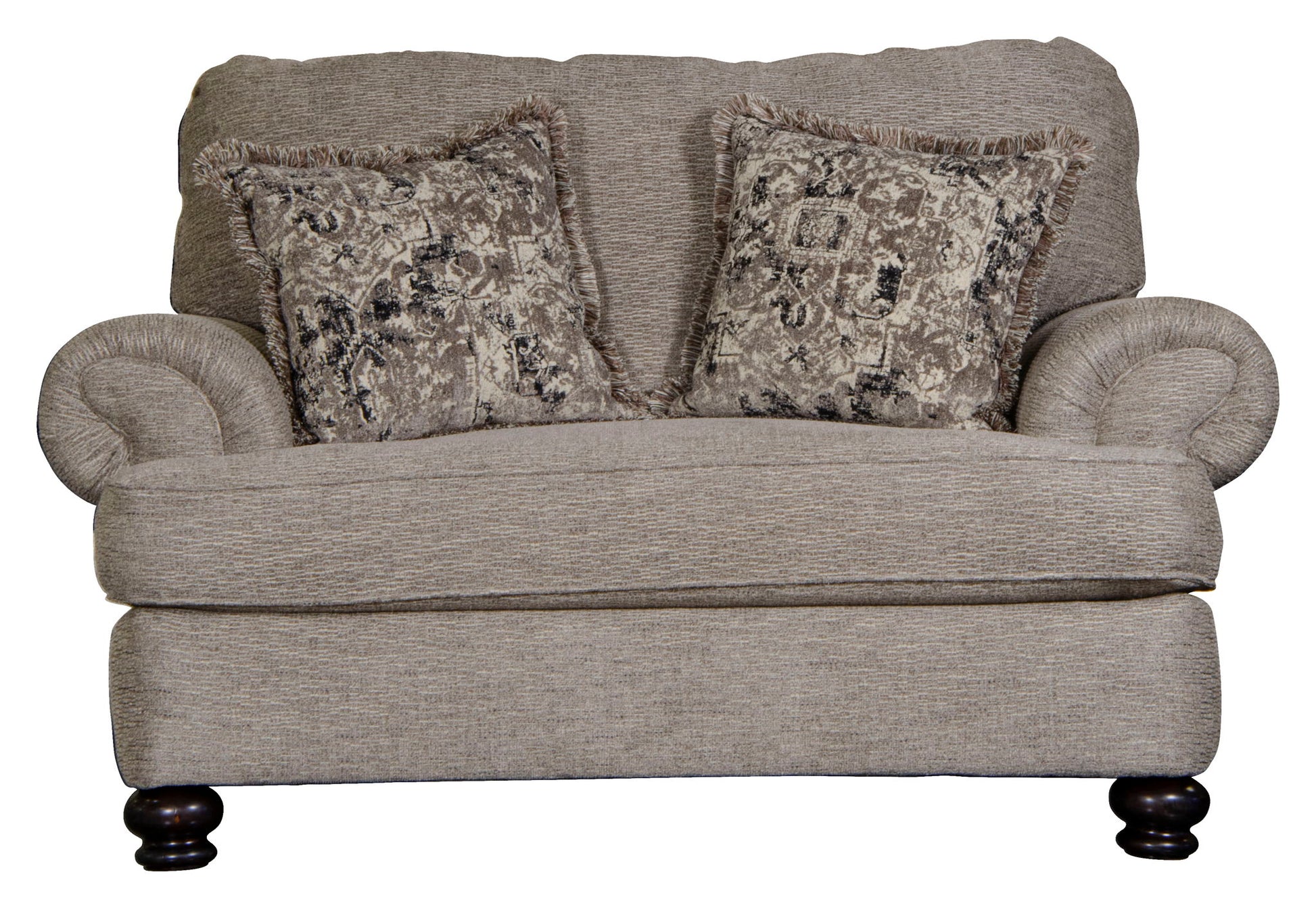 The Freemont collection is big and deep featuring traditional rolled arm design with wooden legs and correlating toss pillows in decorative fringe.