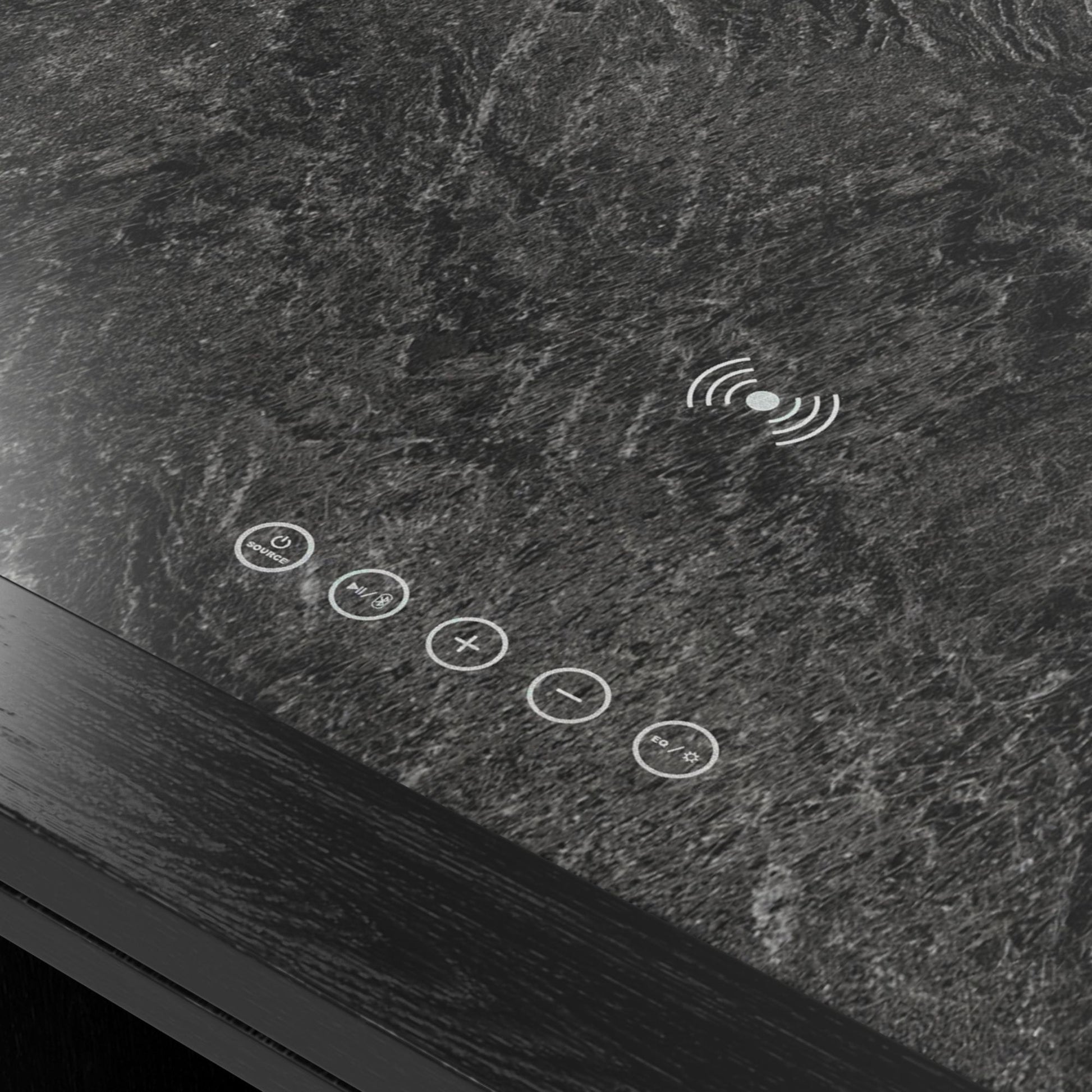 The Halo Smart Occasional Table Set accents your home in modern design. The touchscreen interfaces and wireless charging functionality on elegant sintered stone tabletops add practical convenience without sacrificing aesthetics, while the Bluetooth speakers allow for effortless device pairing. The coffee table fridge drawers keep snacks and drinks comfortably cool and feature aesthetic polychromatic LED lighting. Enhancing this set versatility, the streamlined black finish makes this set easy to pair with various color palettes and existing decor. The Halo Smart Occasional Table Set is a perfectly modern blend of both style and convenience.