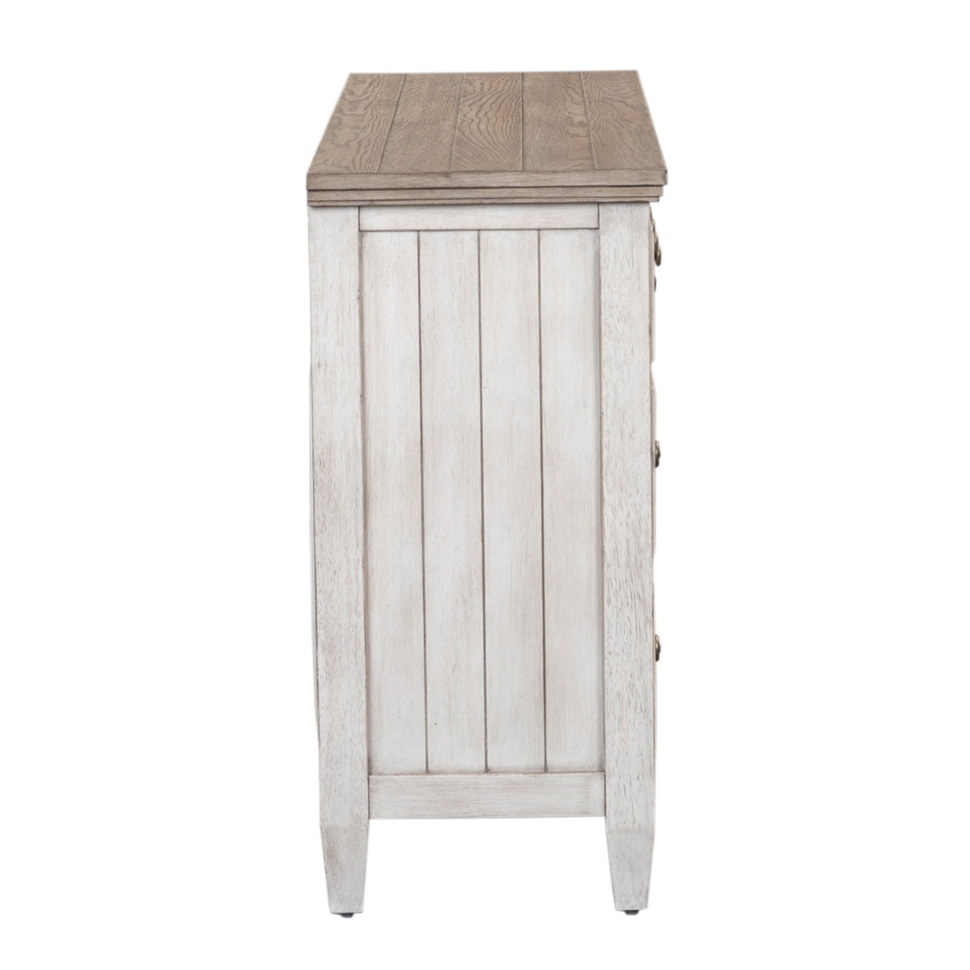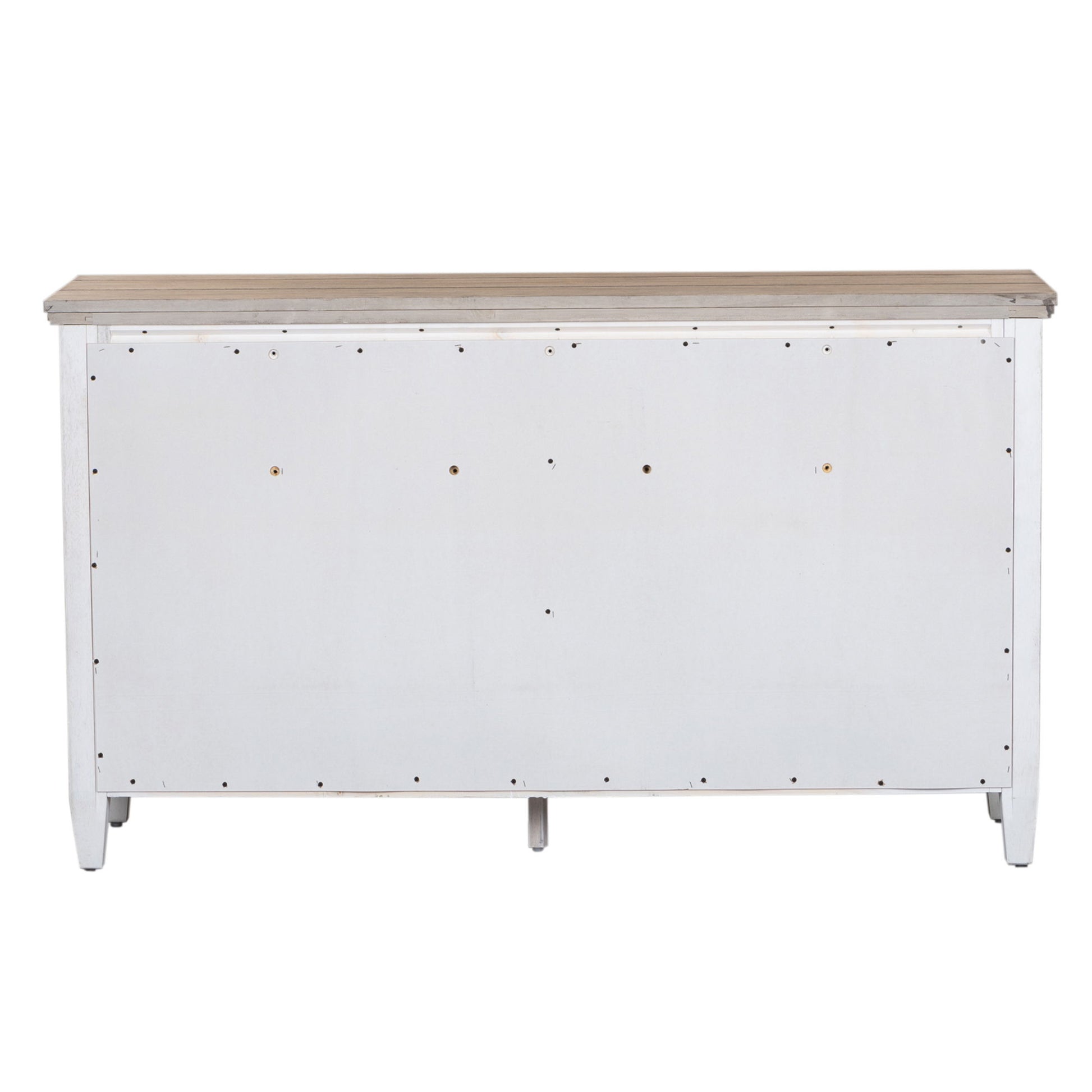 The Heartland 9-drawer dresser is sure to make a statement in any home, as its heavily distressed finish is adaptable to any space. The antique white finish and tobacco tops are accented by raised panels and antique brass hardware. The many drawer sizes allow you maximize storage, with the top drawers being felt lined and the bottom drawers being cedar lined. The wood framed drawers and raised panels on the dresser sides and top creates a classic cottage style.