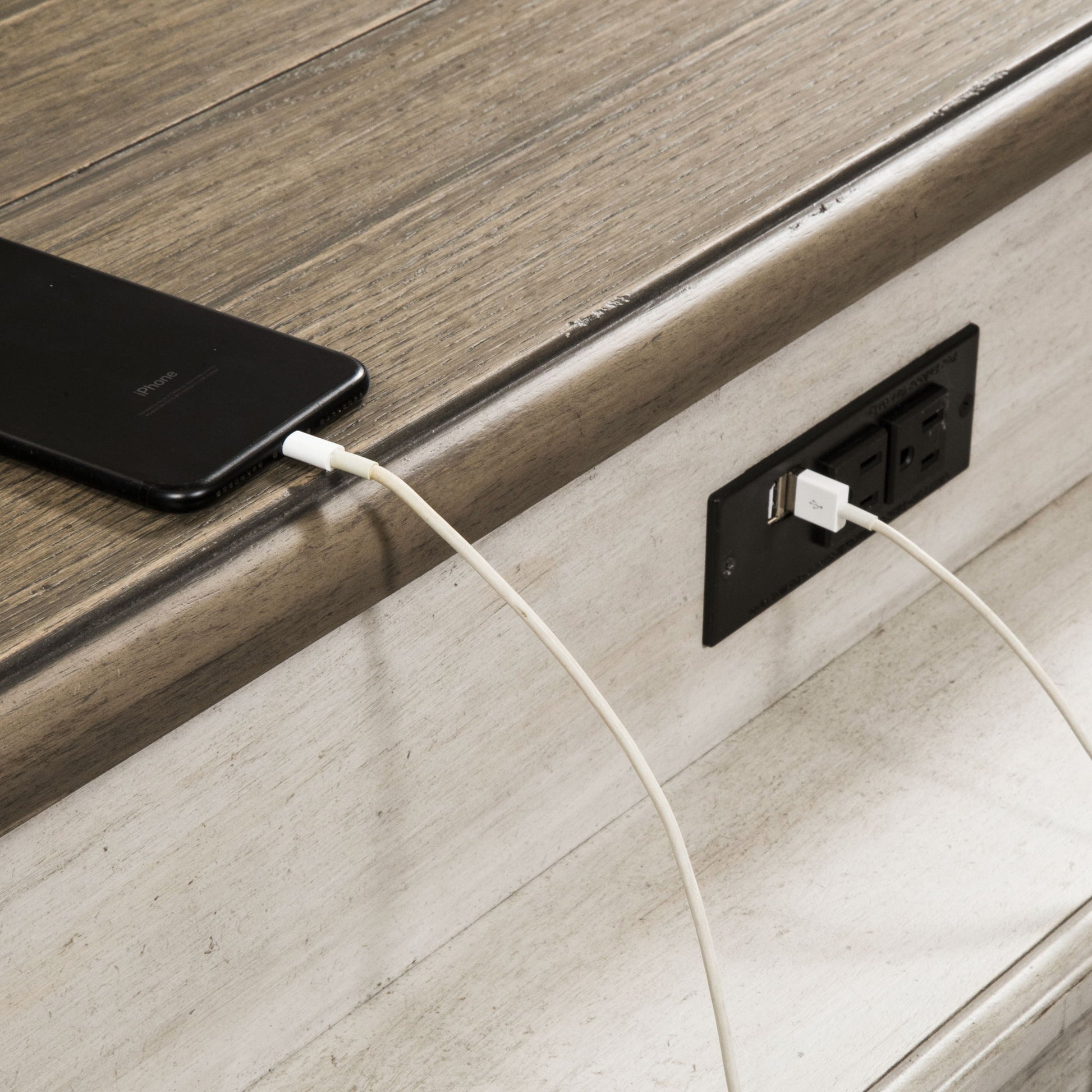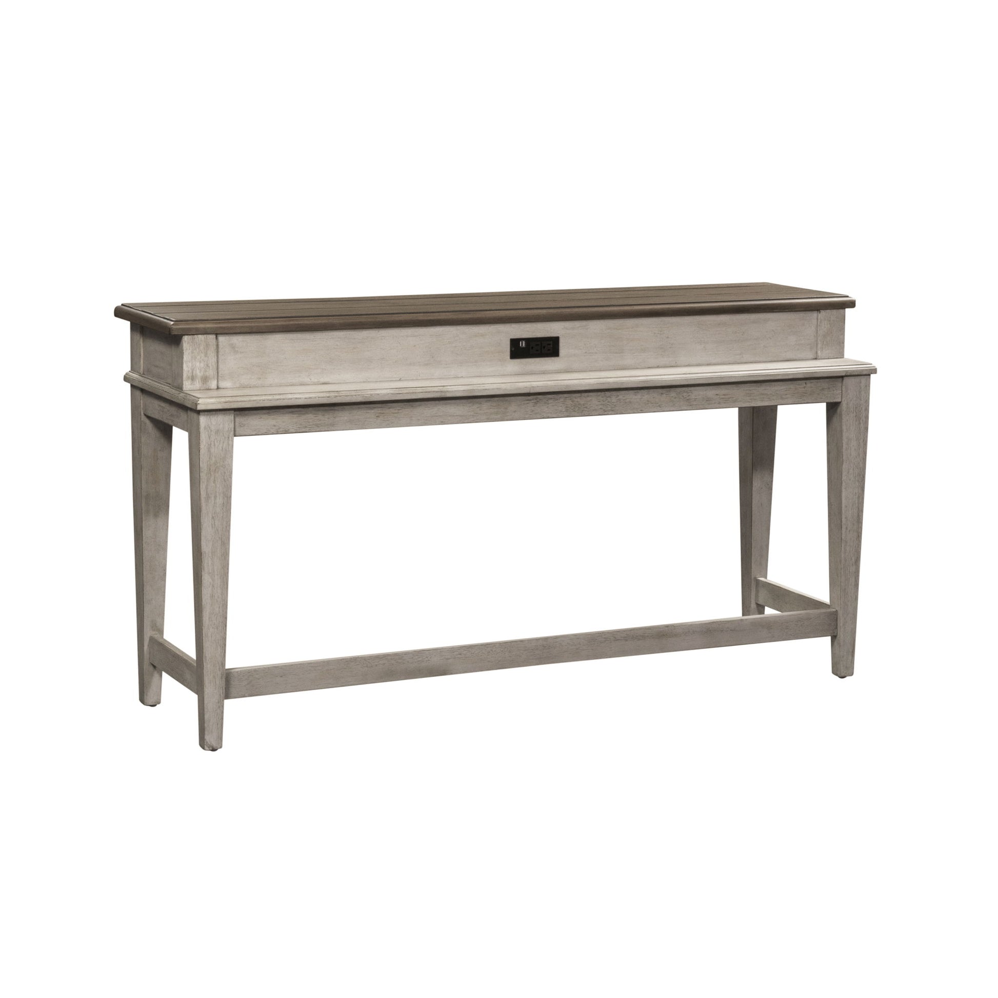 Accent your space with the Heartland console bar table. Crafted of rubberwood solids with cathedral white oak veneers, this piece features an antique white finish with a planked tobacco top, anchored by square tapered legs and a convenient electrical outlet with two receptacles and two USB ports. This simplistic console bar table would make a gorgeous accent piece to any traditional or farmhouse space.