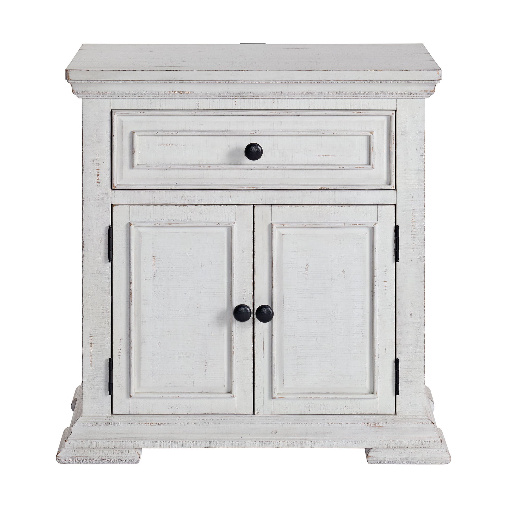 Accent your bedroom with the artistic style of the Heather 1-Drawer Nightstand with USB. Made with solid pine wood in an aged white finish, the sophisticated nature of this piece gracefully accents your space. A molded frame and beveled feet convey timeless, traditional style, while sleek, black drawer and cabinet knobs create a clean contrast. French and English dovetailing denote skillful drawer craftsmanship, while a conveniently integrated USB port allows you to easily charge electronics from your bedside. For an artistic and refined addition to your treasured space, choose the Heather 1-Drawer Nightstand’s smart design.