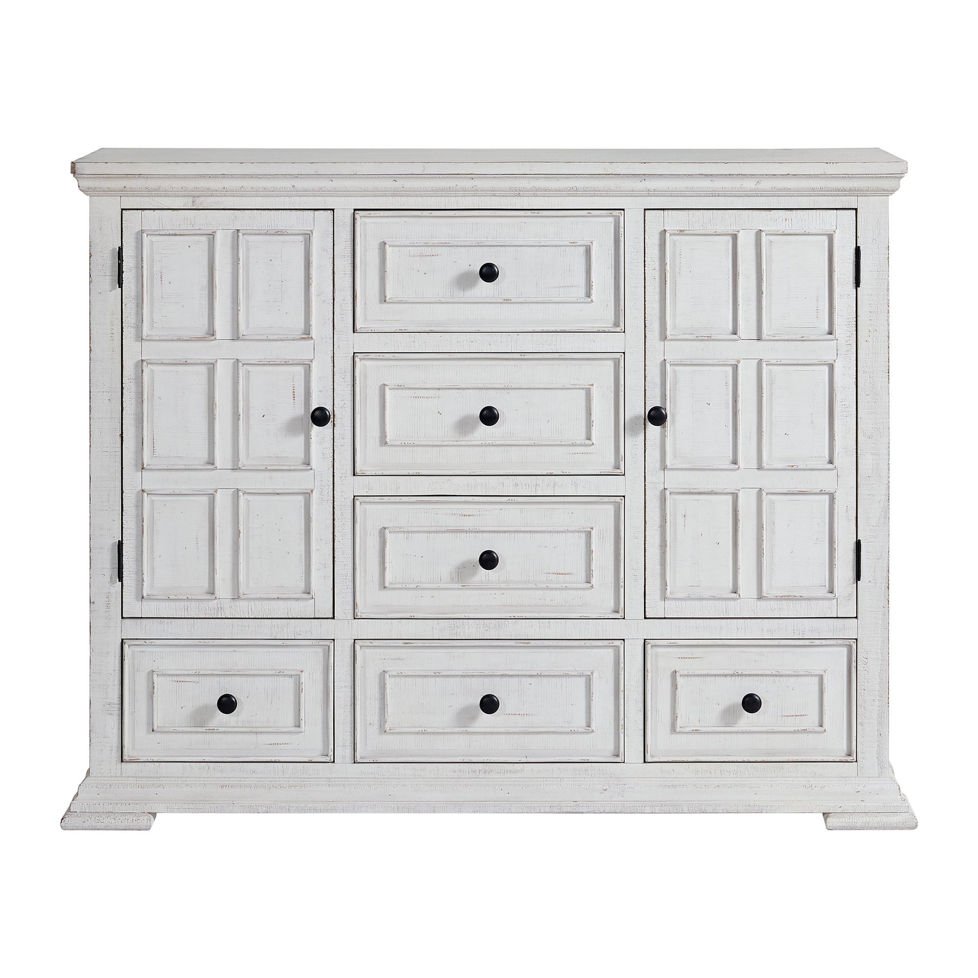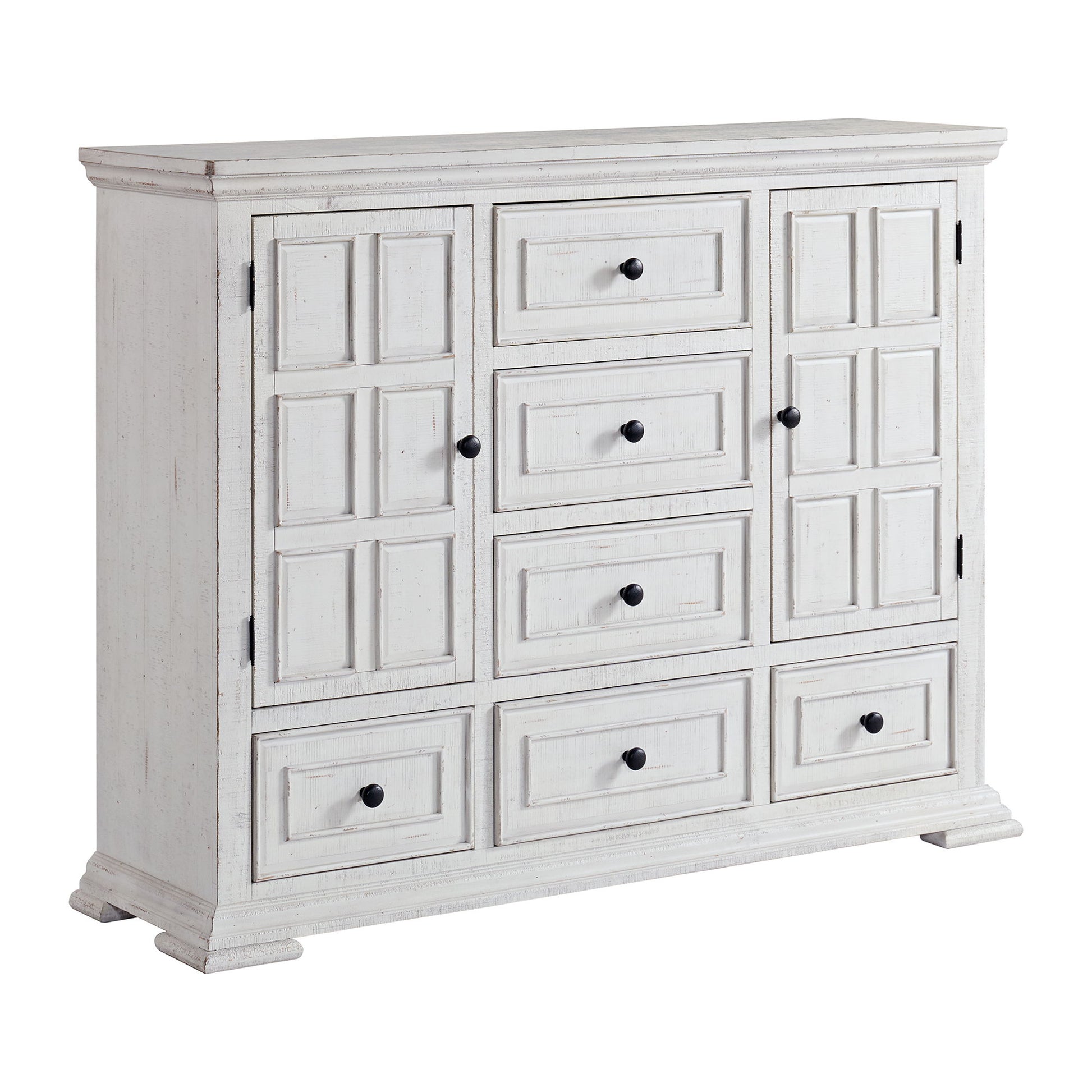 Accent your bedroom with the intricate style of the Heather 6-Drawer Dresser. Made with solid pine wood in an aged white finish, the sophisticated nature of this piece easily becomes a focal point in your space. The molding on the frame and beveled feet conveys timeless, traditional style, while sleek, black knobs on the drawers and cabinet doors create a clean contrast. French and English dovetailing denote skillful craftsmanship, while smoothly operating ball bearing glides are built for effortless utility. For an artistic and refined addition to your bedroom, choose the Heather 6-Drawer Dresser smart design.