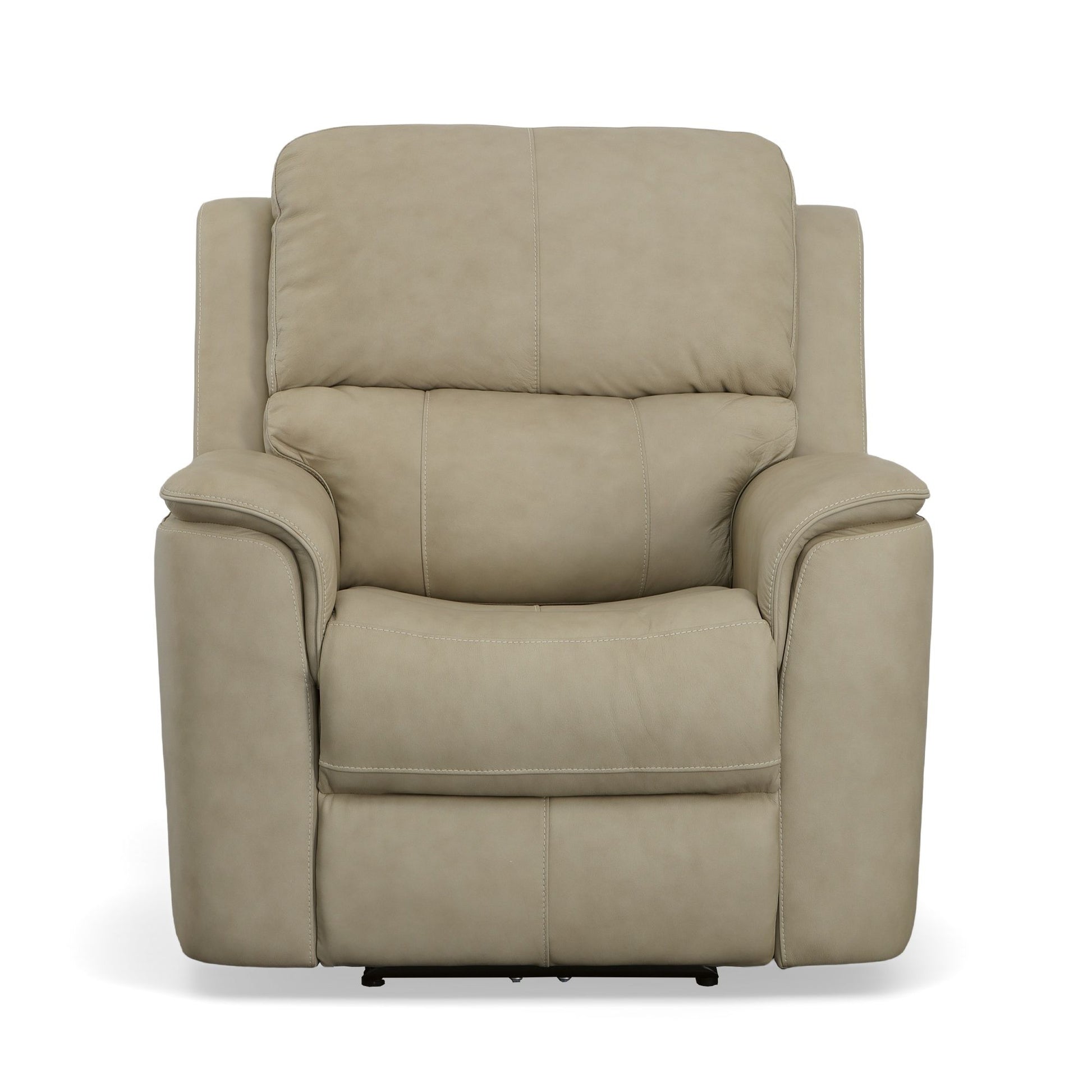 Treat yourself to a comfortable yet refined sitting experience with the Henry leather power recliner with power headrest and lumbar. This generously scaled frame is upholstered in a durable beige leather, and features a contoured seat and padded arms with a unique sculptural shape and welt trim. Power recline, headrest and lumbar control on the right side allows for customized comfort, and an included USB port provides convenient device charging. The Zero Gravity recline technology gives the feeling of weightlessness while Flexsteel's patented Blue Steel Spring™ provides lasting seat support.