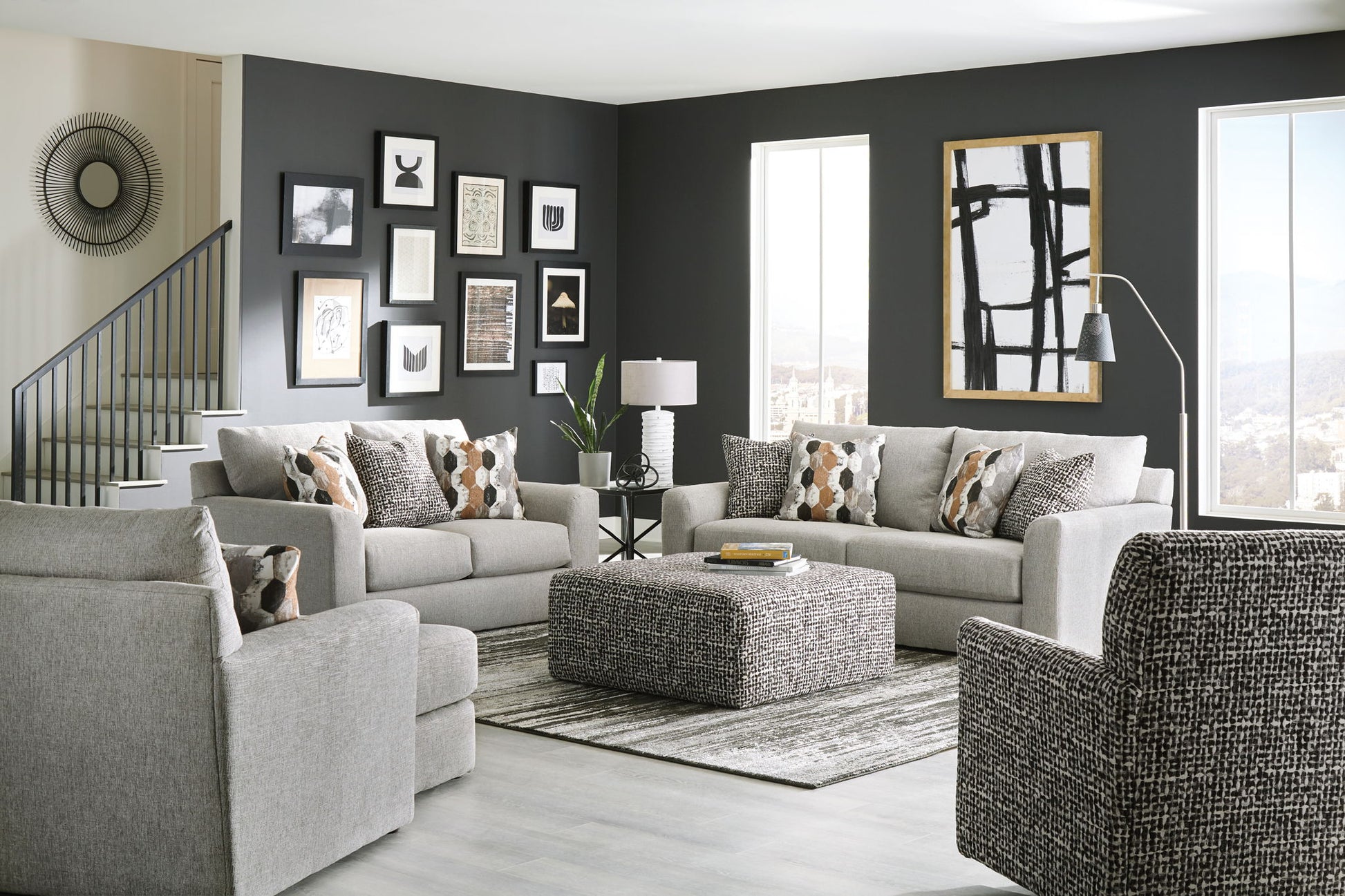 Transitional styling at it's best! The Hooten collection boasts multi-color, textured body fabric coordinated beautifully with geometric accent pillows. While style was top priority for the Hooten collection, comfort is always our first priority. The Hooten is designed to be bigger and deeper. The kind of piece you can curl up in. The seating is constructed with 50+ individually pocketed coils encased in foam, topped with a layer of cool gel infused memory foam and wrapped in a layer of synthetic fiber. This creates a comfortable and supportive seat that will last much longer than traditional foam only seating. The frame is constructed with Steel-Tech framing which adds support to the framing structure and keeps the high tension sinuous springs that support the seat cushions from warping or pulling free from the frame.