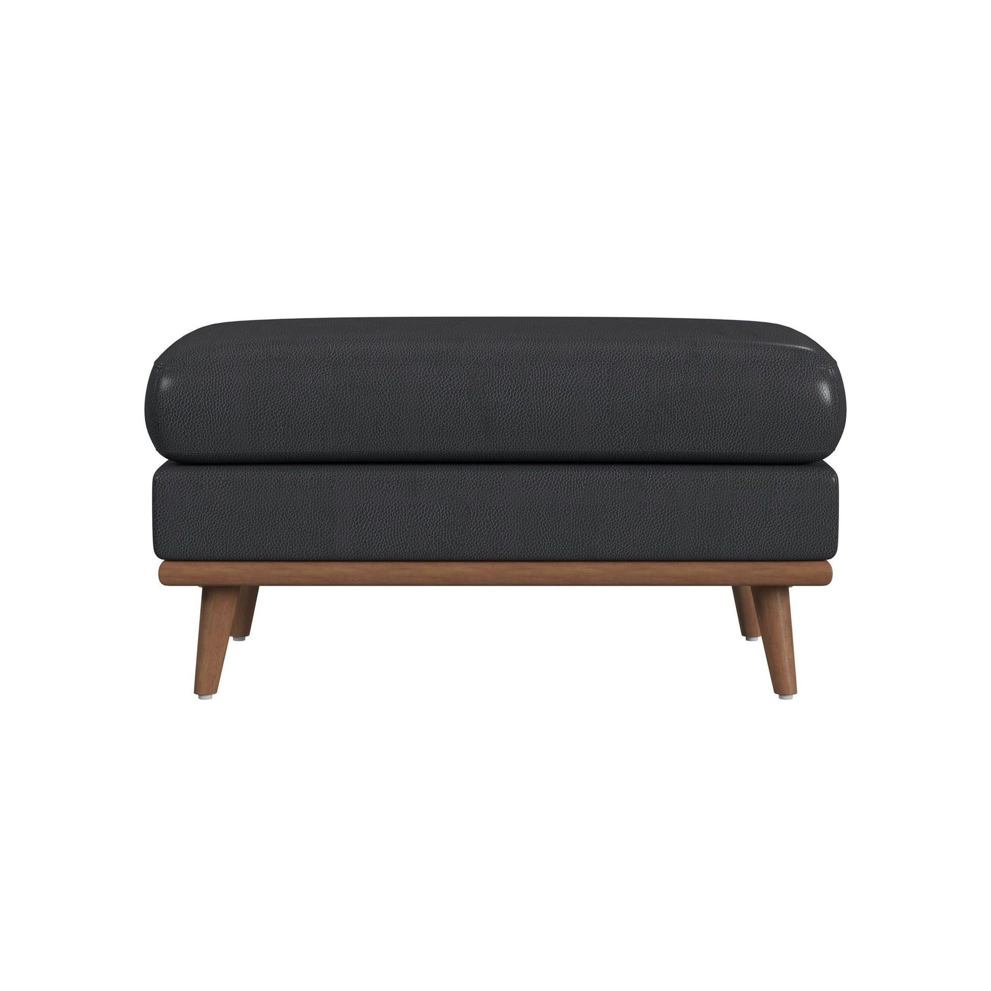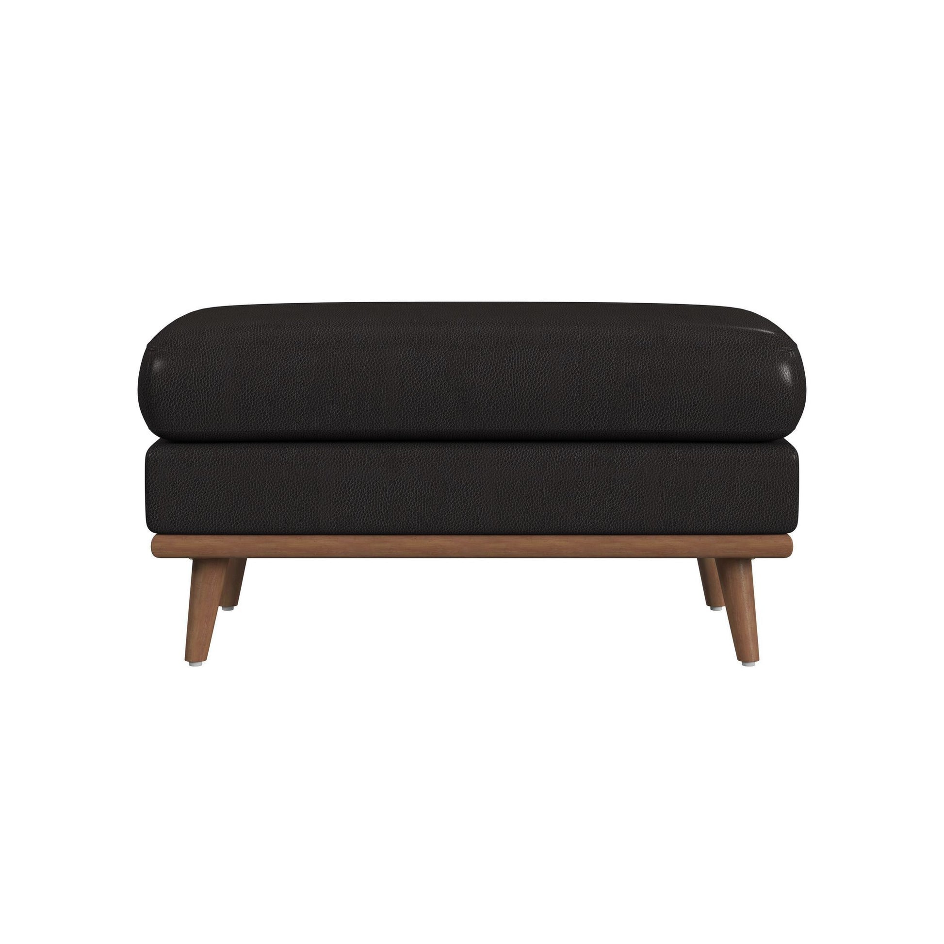 The Horizon Ottoman with Wood Base exudes the coveted charm of mid-century modern style. Built with a wood frame that is full upholstered in quality faux leather, this piece is built for durability. Comfortable foam cushioning and exposed wood legs mark thoughtful design, while the piece freestanding nature permits versatility in utility and staging options. For a refined and sleek addition to your living space, the Horizon Ottoman with Wood Base delivers in quality and style.