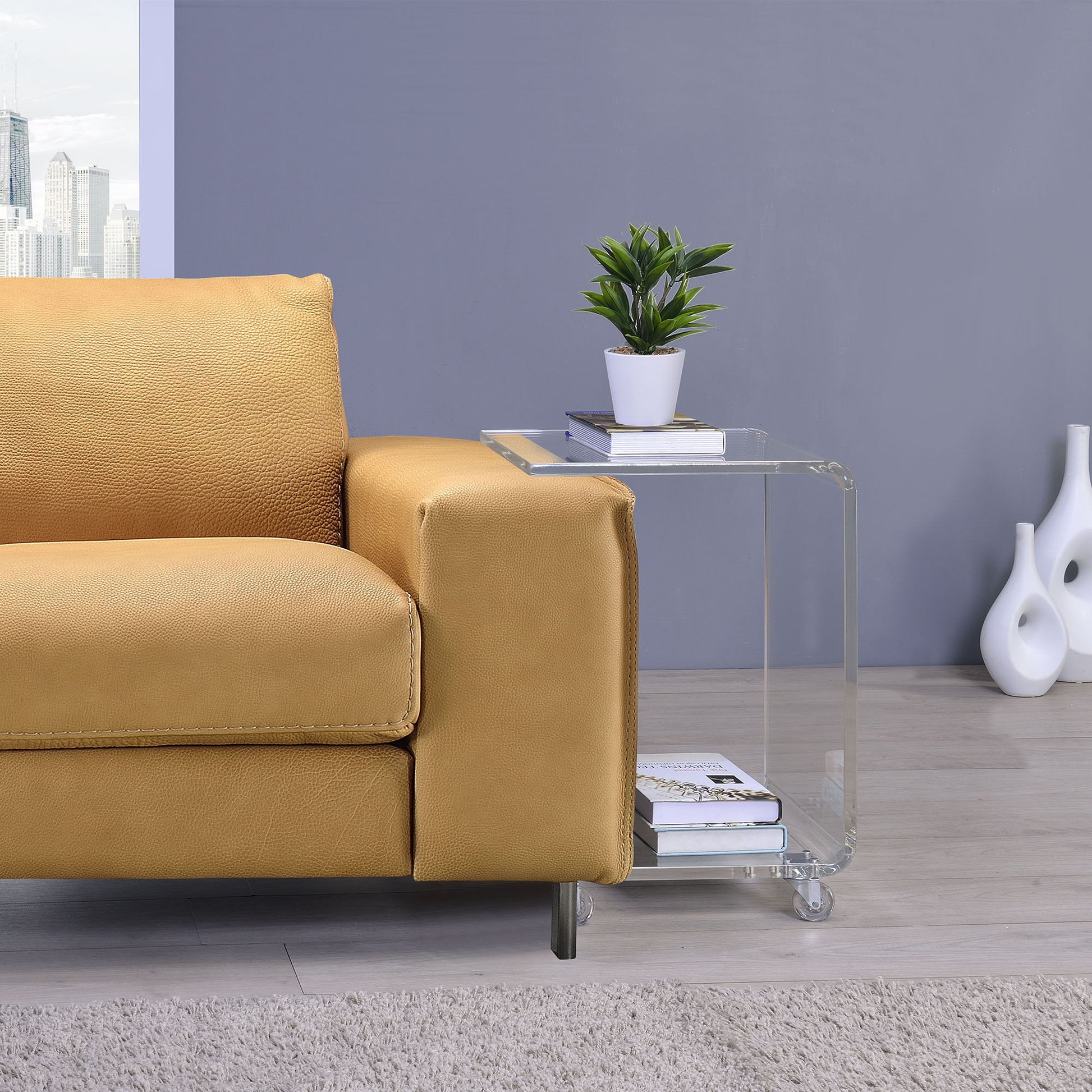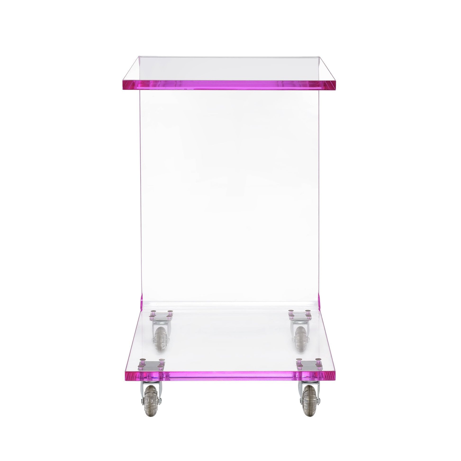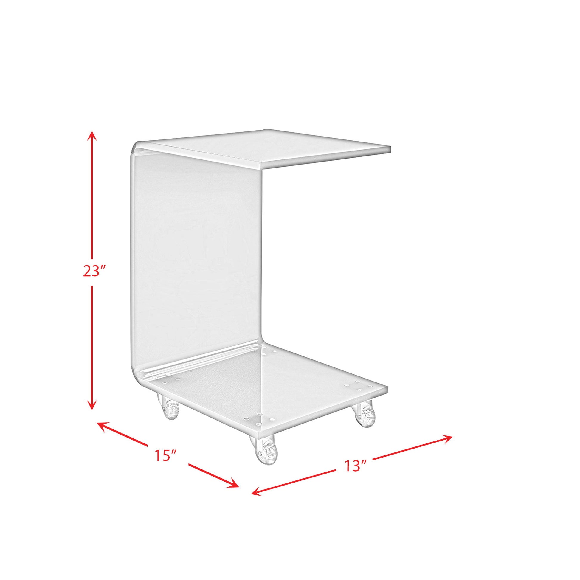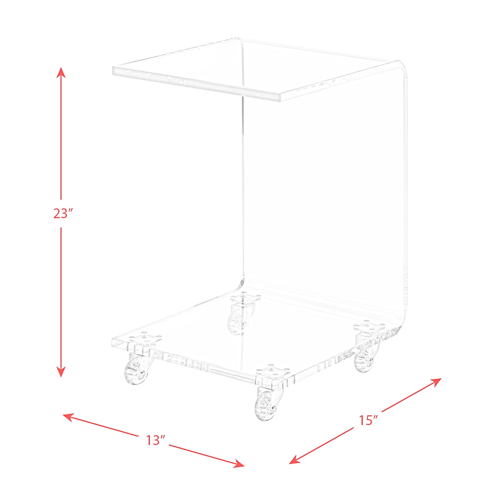 The Iris Acrylic Snack Table is the missing piece to your home! This table comes on clear casters. Dont worry if casters arent your style, they can easily be removed. Roll this snack table with ease up to your sofa and find a spot for your drinks and snacks while you binge watch your favorite shows. The shelf on the bottom lets you add your personal style with any of your favorite decor. The entire table is made out of clear acrylic, making it permanent staple in your home year after year.