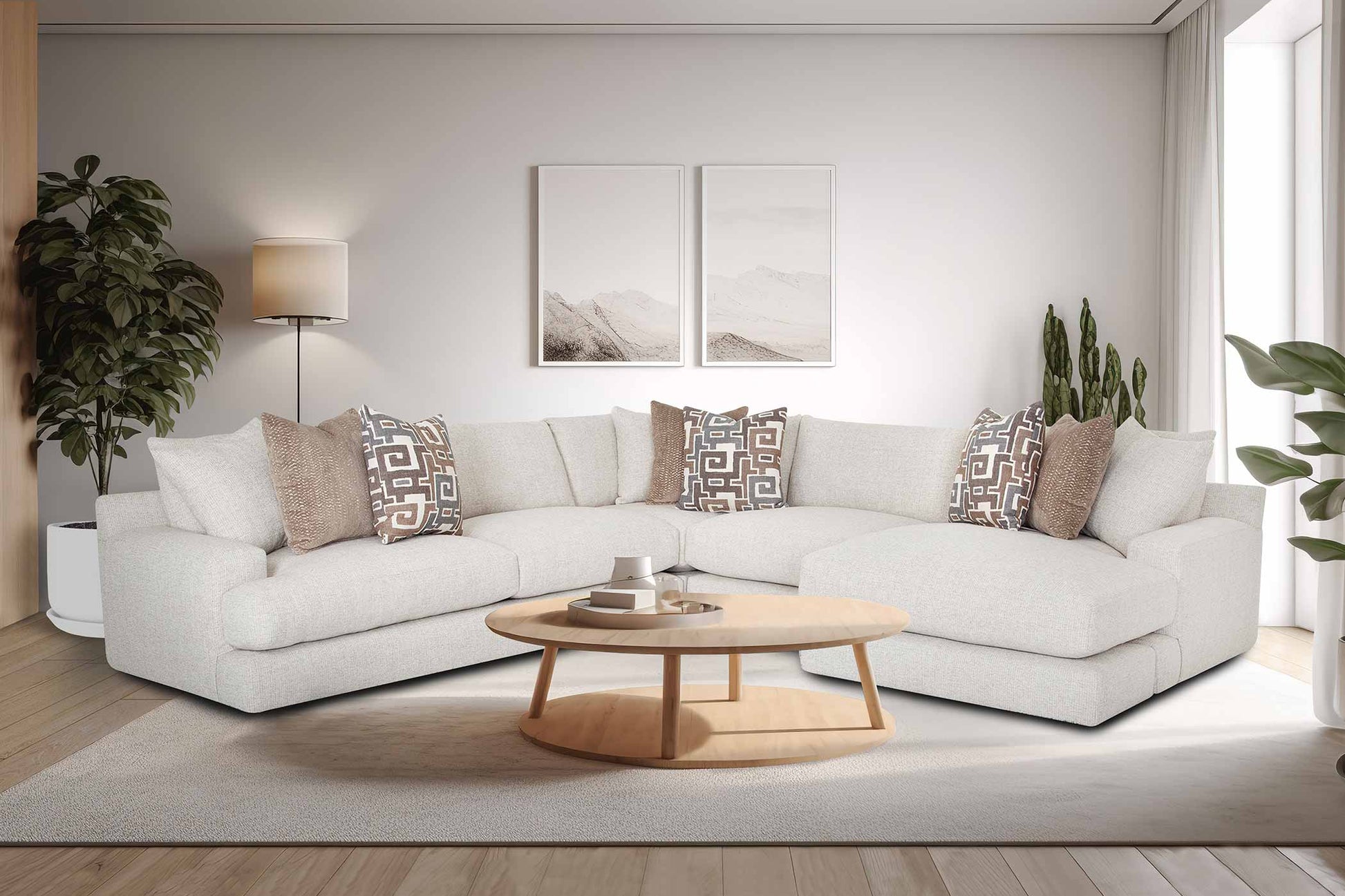 The Jude Sectional Sofa blends sleek modern design with customizable functionality, making it the perfect centerpiece for your living room. Upholstered in a soft, durable neutral fabric, this modular sectional complements any décor while providing long-lasting comfort and style.