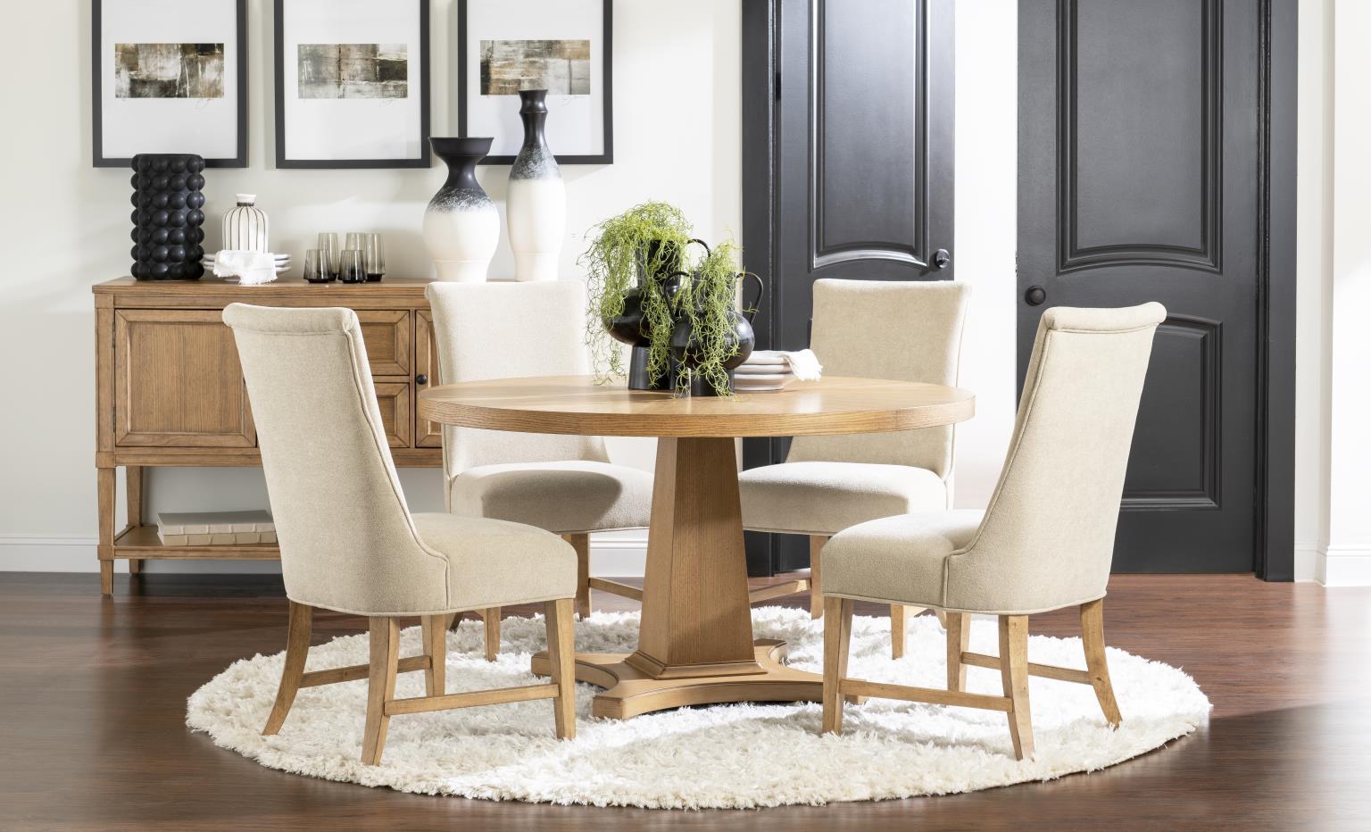 Crafted of Oak Veneers,, the Linden group is finished in a warm Honey Oak tone with shaping on the legs and on the pedestal base of the round table. The classic credenza silhouette has 2 doors and 2 drawers and a bottom shelf. Traditional profiles mixed with country and rustic elements allow this collection to work in multiple design settings. This casual dining collection is scaled to perfectly fit smaller dining areas,, breakfast nooks and open concept plans. The rectangular dining works great as a smaller set or in a more formal dining area,, with seating for up to 6.