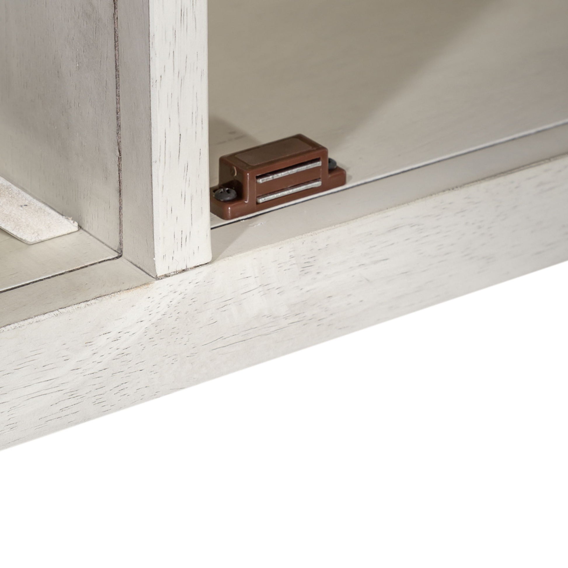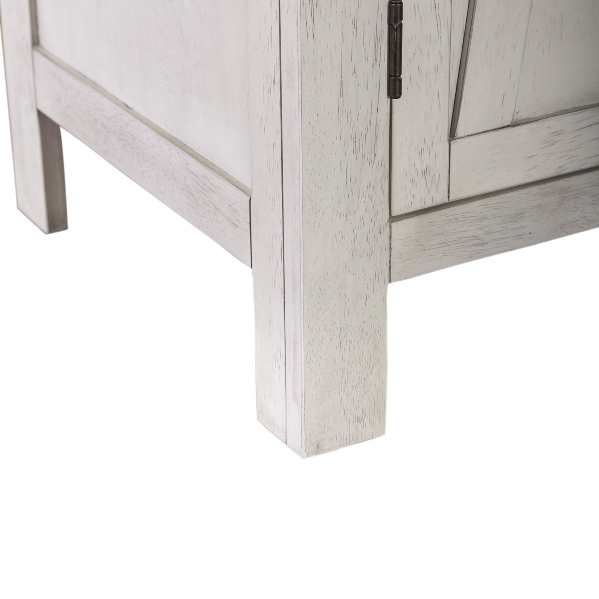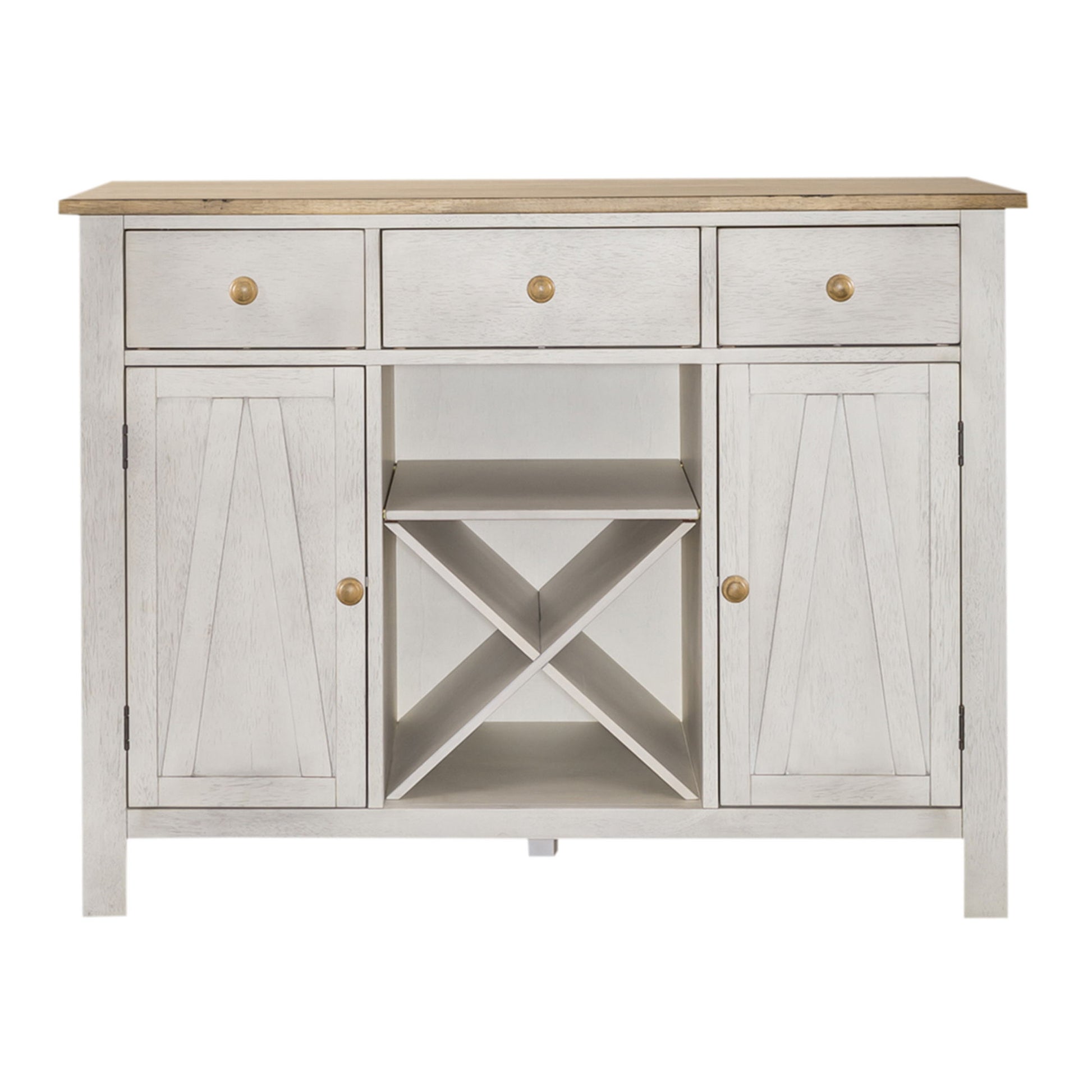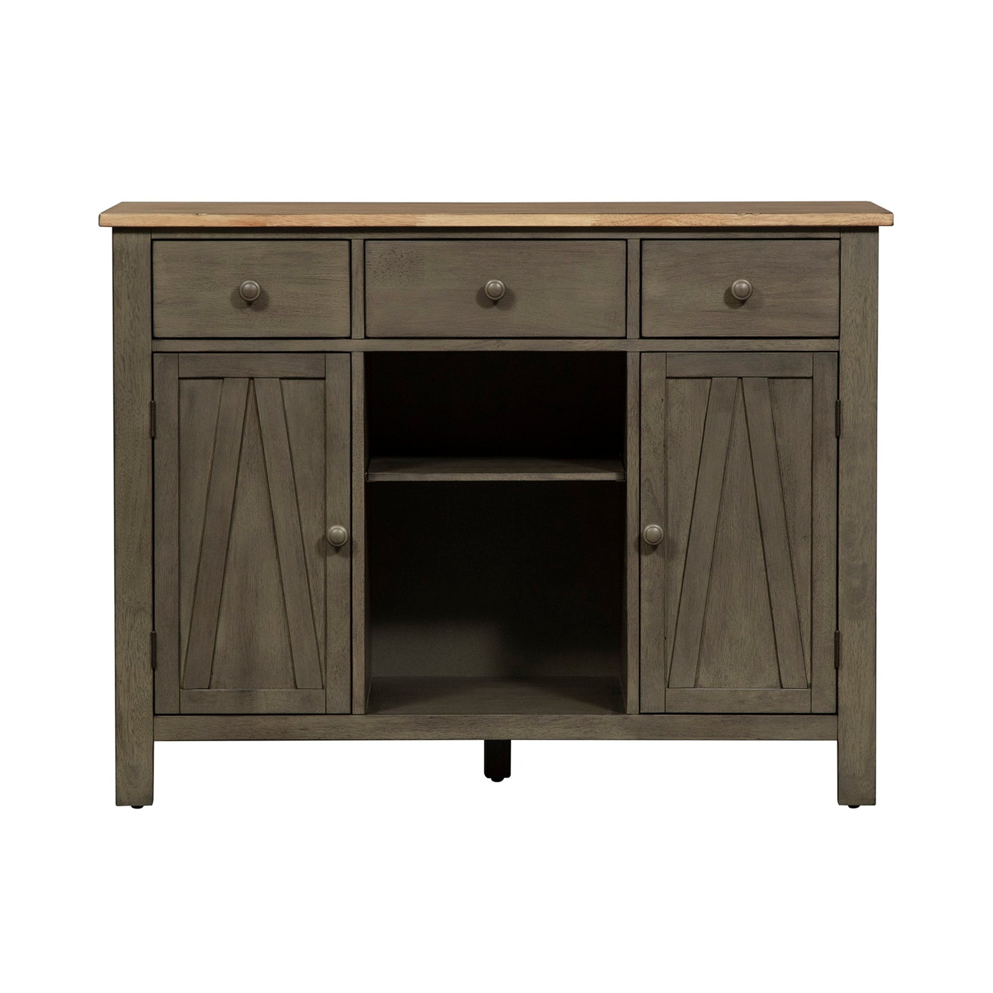 Invite a classic look with a casual feel into your home with the Lindsey Farm server. Crafted of rubberwood solids and veneers with MDF, this piece features inverted v design on both doors, levelers to protect your flooring and adjust the height, three drawers accented with gray wood knob hardware, one adjustable shelf behind each door, and removeable x shaped wine shelving. This piece has an alternate finish and offers a look that compliments today's homes with style uncompromised.