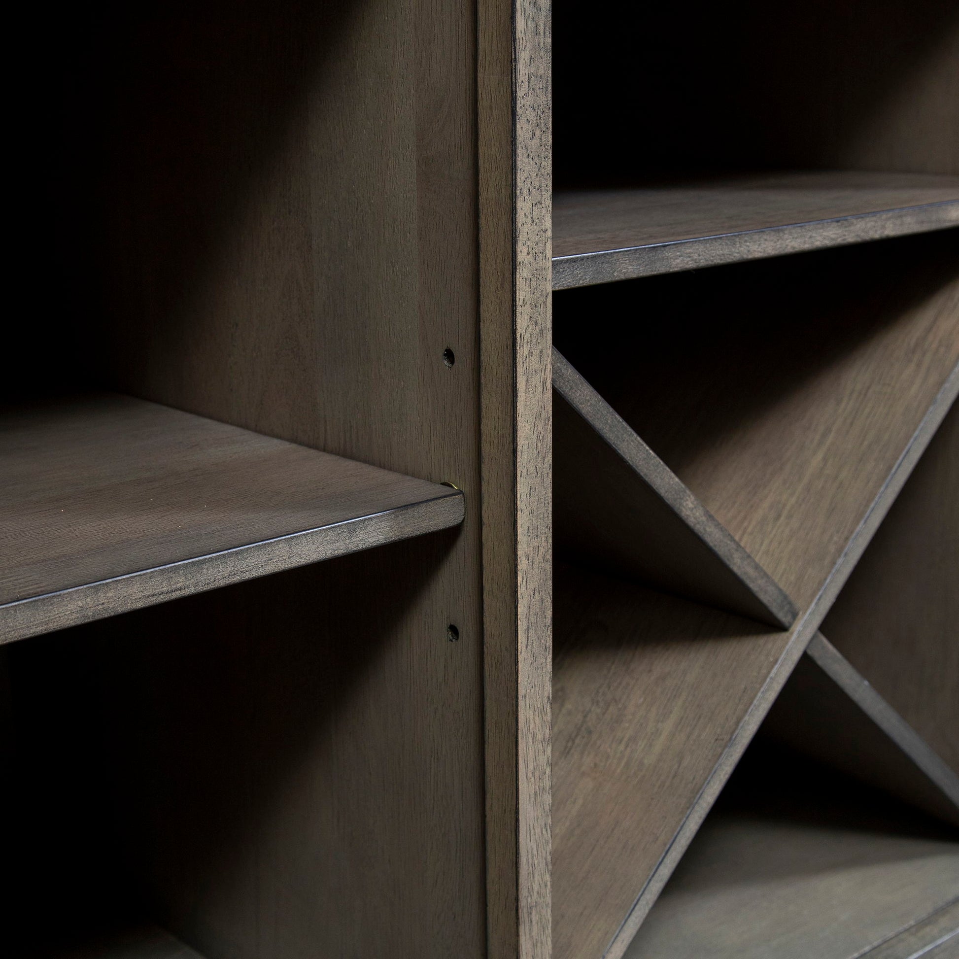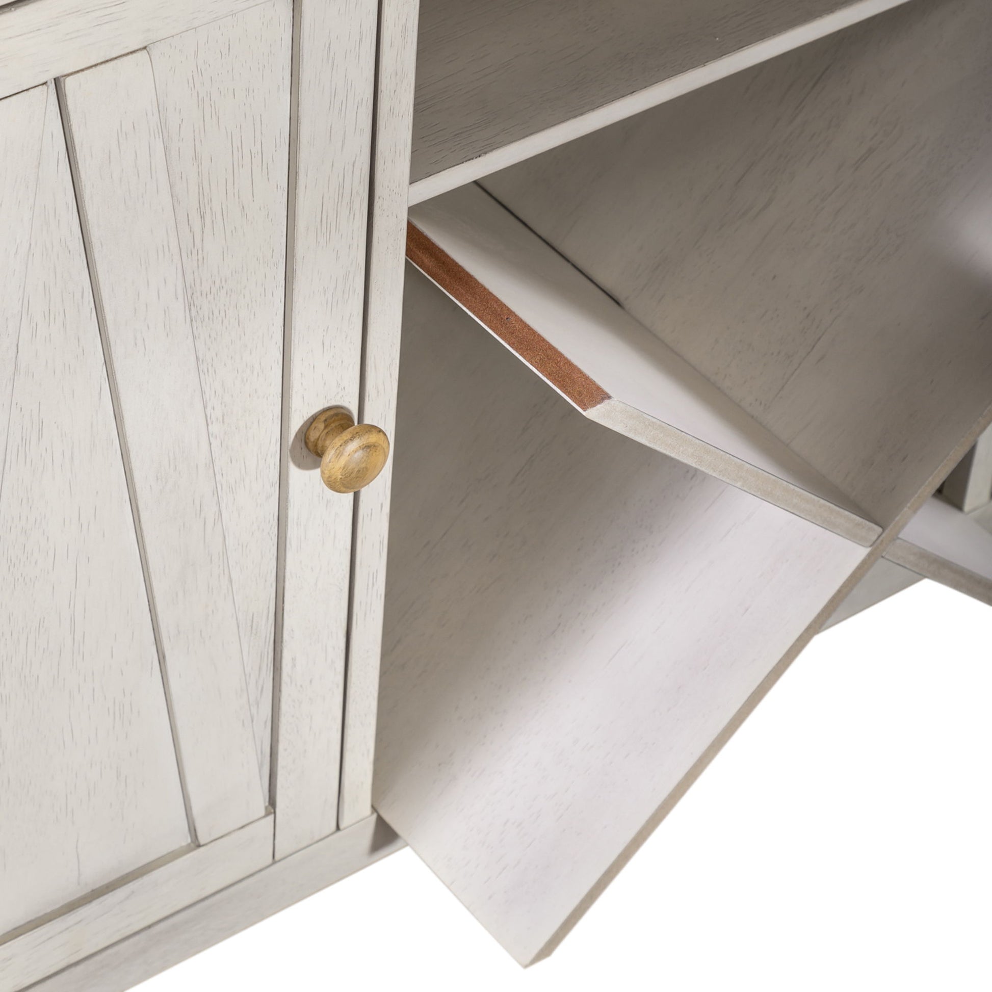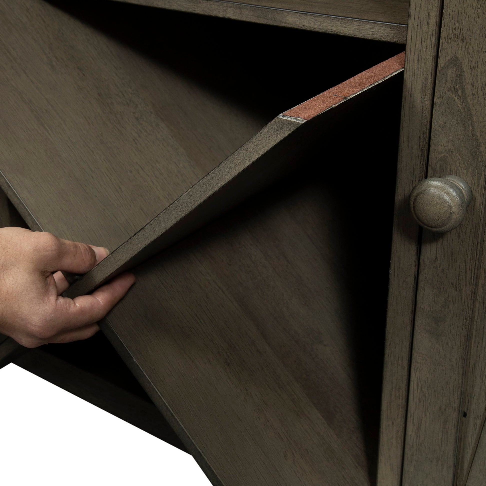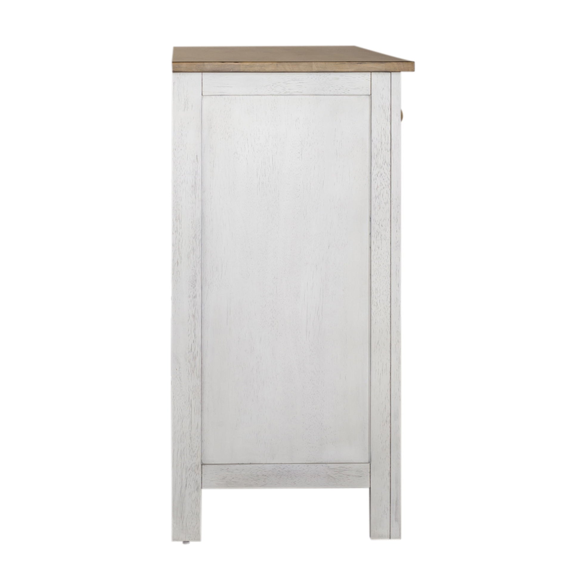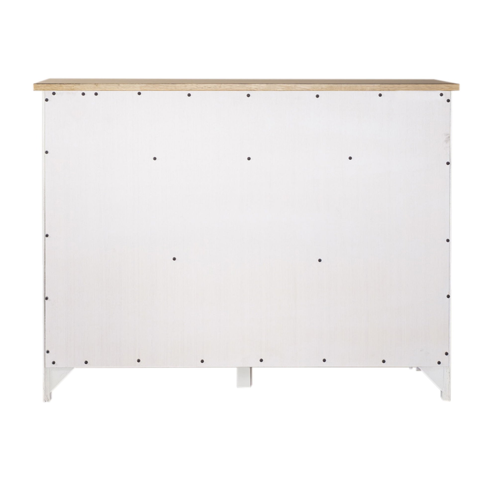 Invite a classic look with a casual feel into your home with the Lindsey Farm server. Crafted of rubberwood solids and veneers with MDF, this piece features inverted v design on both doors, levelers to protect your flooring and adjust the height, three drawers accented with gray wood knob hardware, one adjustable shelf behind each door, and removeable x shaped wine shelving. This piece has an alternate finish and offers a look that compliments today's homes with style uncompromised.
