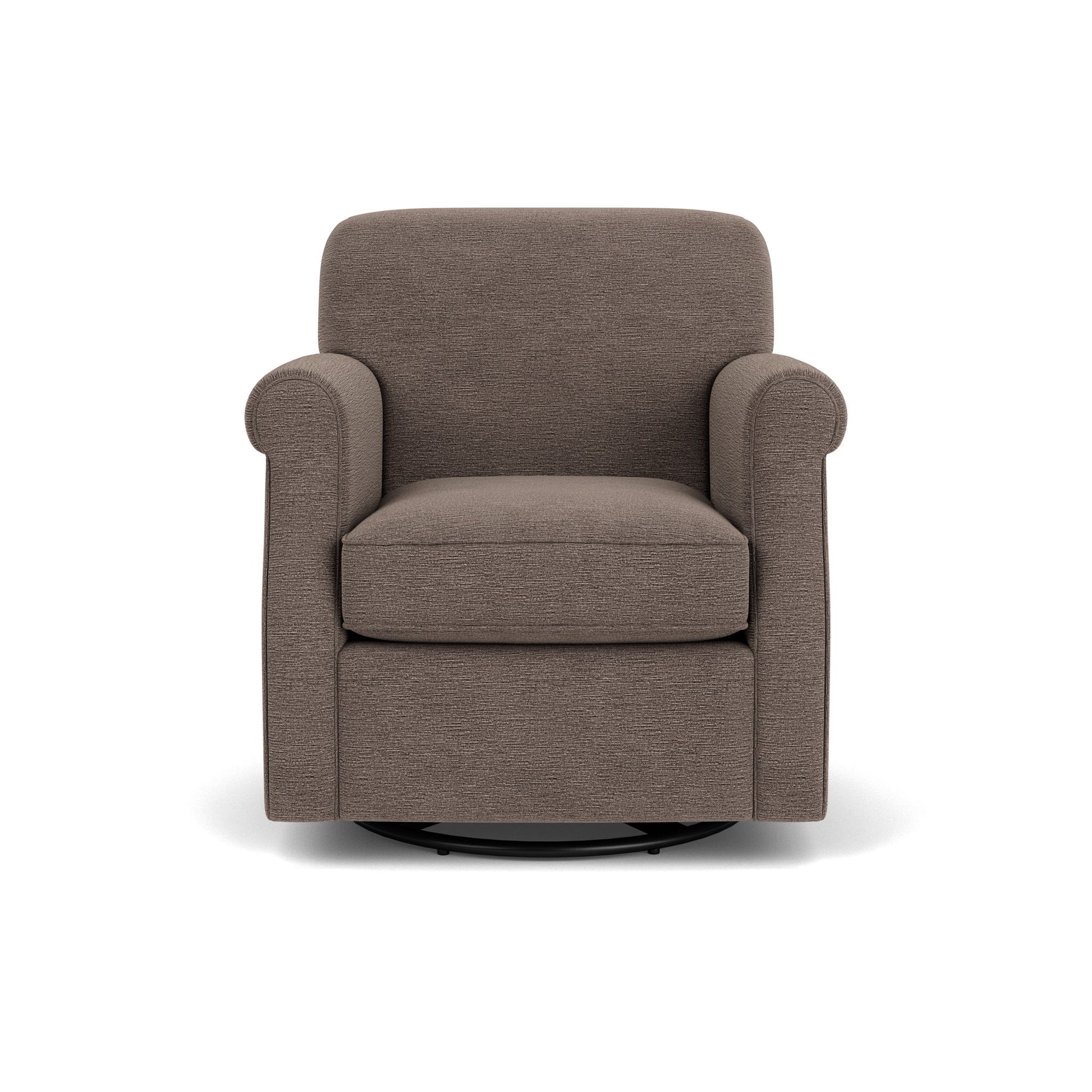 Small-scale design with rounded features. Mabel’s simple structure gives way to a rounded tight back cushion and traditional rolled arms. Welt cording outlines the arm fronts and seat cushion for a clean look, and its ability to swivel makes it an irresistibly fun, casual piece.