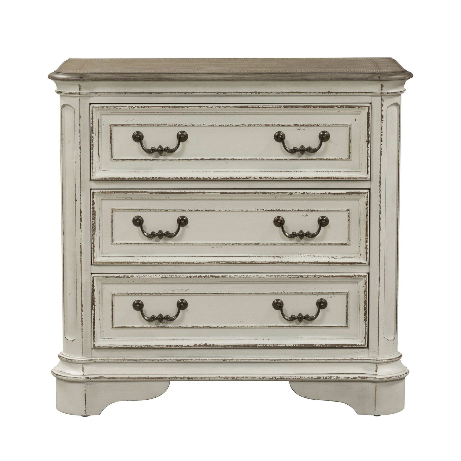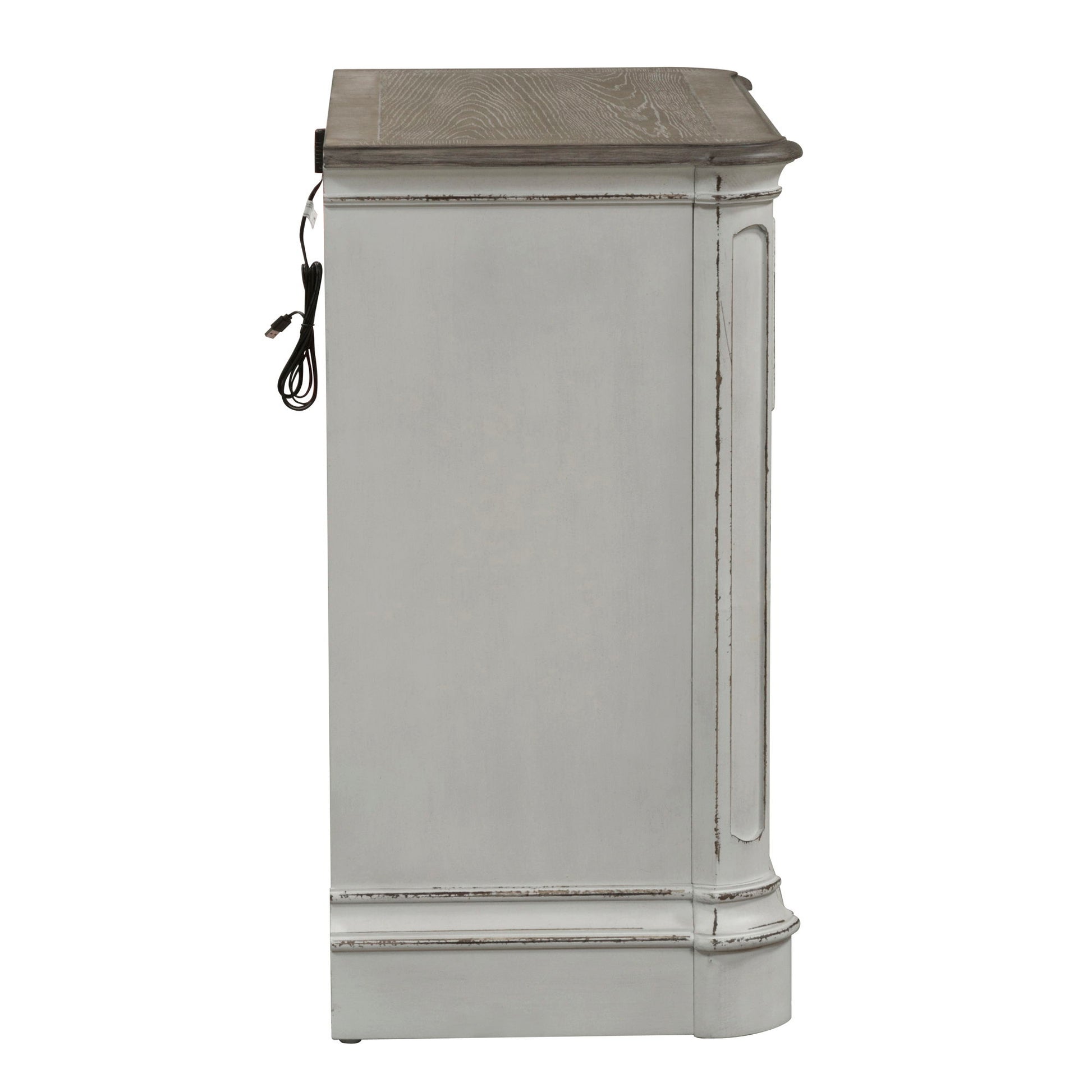 This 3-drawer bedside chest is the perfect way to accent your room with an effortless blend of European Traditional design. Weathered brown whitewash top paired with the antique white finish creates a truly unique look. Softness is added to the design with canted corners and rounded pilasters, accompanied by bead molding on each drawer front. The chest features a felt lined top drawer, cedar lined bottom drawer and bottom case dust proofing that is accented by custom antique pewter bail and knob hardware. With today's modern technology in mind, users can enjoy the benefit of the incorporated charging station, featuring two USB ports, making multi device charging a breeze.