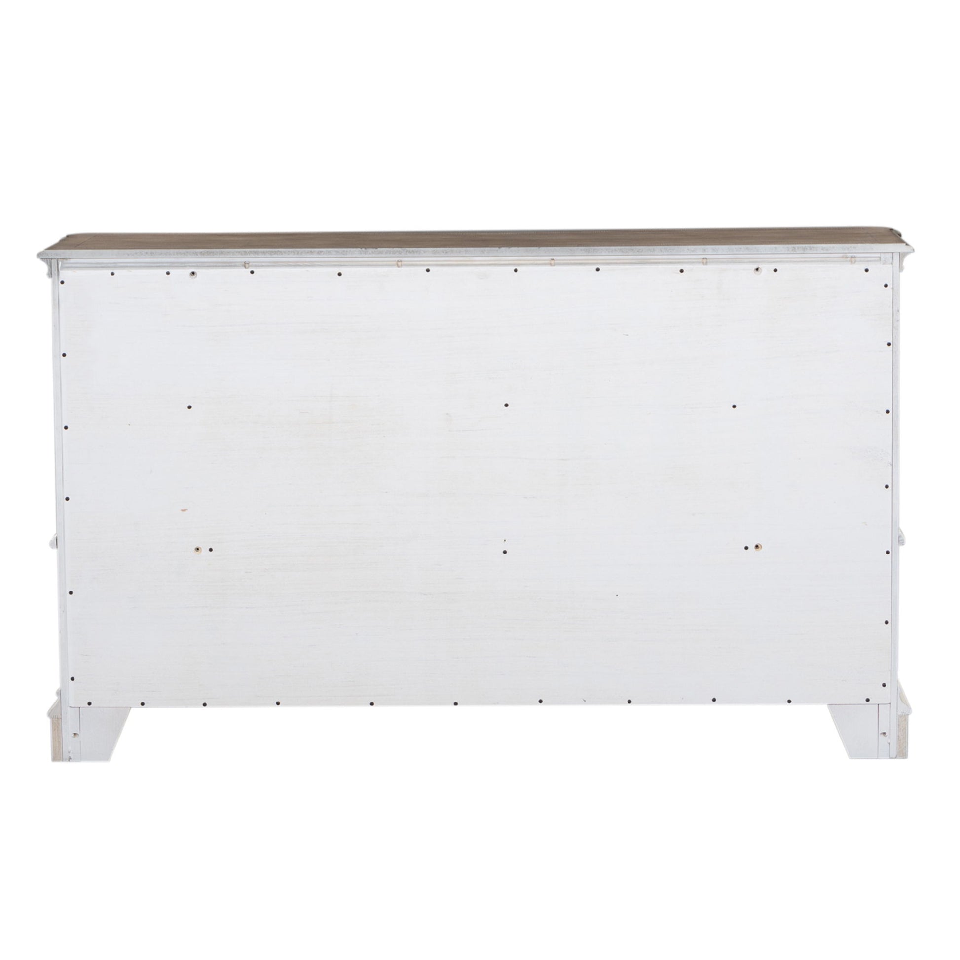 This unique bow front dresser is the perfect way to accent your room with an effortless blend of European Traditional design. Weathered brown whitewash top paired with the antique white finish creates a truly unique look. Softness is added to the design with canted corners and rounded pilasters, accompanied by bead molding on each drawer front. The dresser features fully stained interior drawers, felt lined top drawers, and cedar lined bottom drawers that are accented by custom antique pewter bail and knob hardware.
