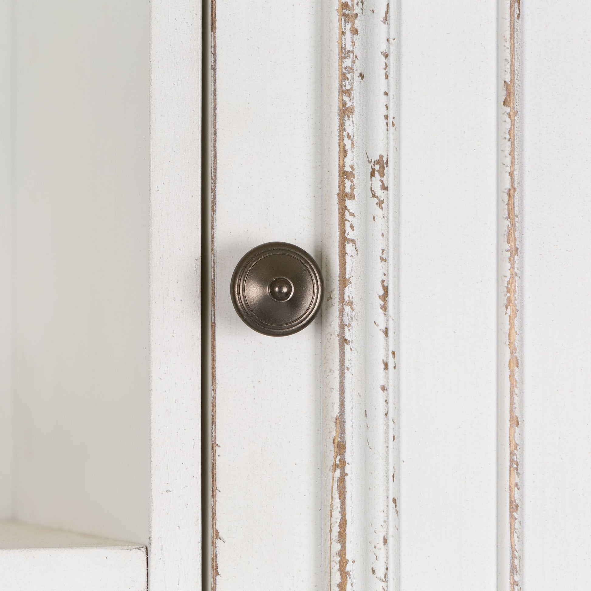 Blend European influences to create the Magnolia Manor credenza and hutch. Crafted with poplar and rubberwood solids with white oak and birch veneers, this piece features framed drawer fronts accented by antique pewter hardware, two large file drawers that can be locked, an open display for storage illuminated by touch lighting, and a flip-down keyboard tray. With today's modern technology in mind, users can enjoy the convenience of the built-in wire management provisions, two outlet ports, and two USB ports. The planked back panel flows throughout the hutch, even behind the two doors where adjustable shelving is located. Warm antique finishes and artistic distressing along with grand scale a group to be passed to generations.