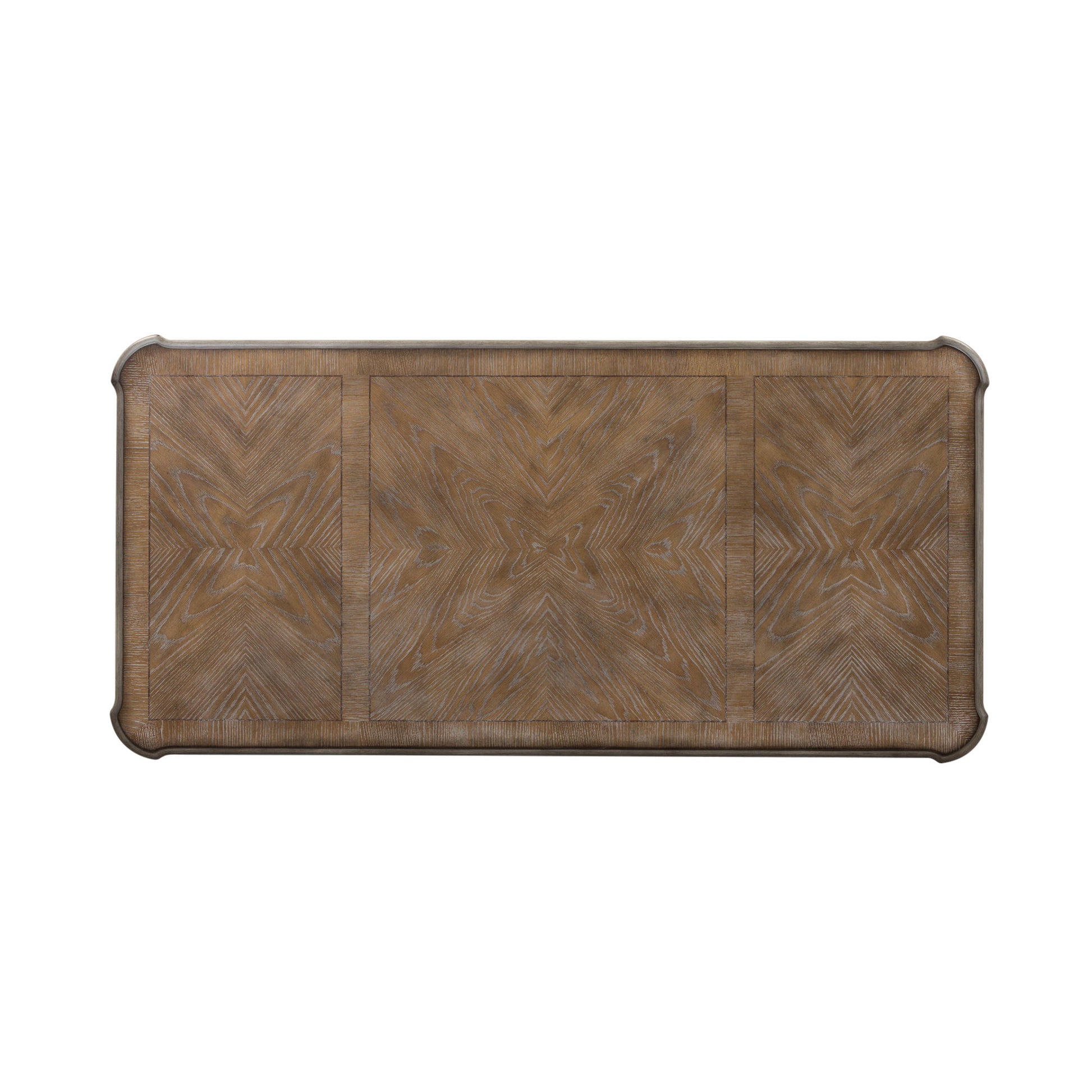 Indulge in the perfect blend of European design with the Magnolia Manor desk. Crafted of poplar solids with white oak and birch veneers, this set features seven fully stained full extension drawers, including two locking file drawers, a flip down keyboard tray that enhances user convenience, 2 hidden doors, wood framed drawer fronts, and canted corners. The top is finished in a weathered brown with whitewash in a fancy face veneer grain direction, bail pull and knob hardware in an antique pewter, features rounded pilasters. Warm antique finishes and artistic distressing along with grand scale create a piece to be passed to generations. With today's modern technology in mind, users can enjoy the added convenience of the built-in wire management provisions, making working from home a breeze.
